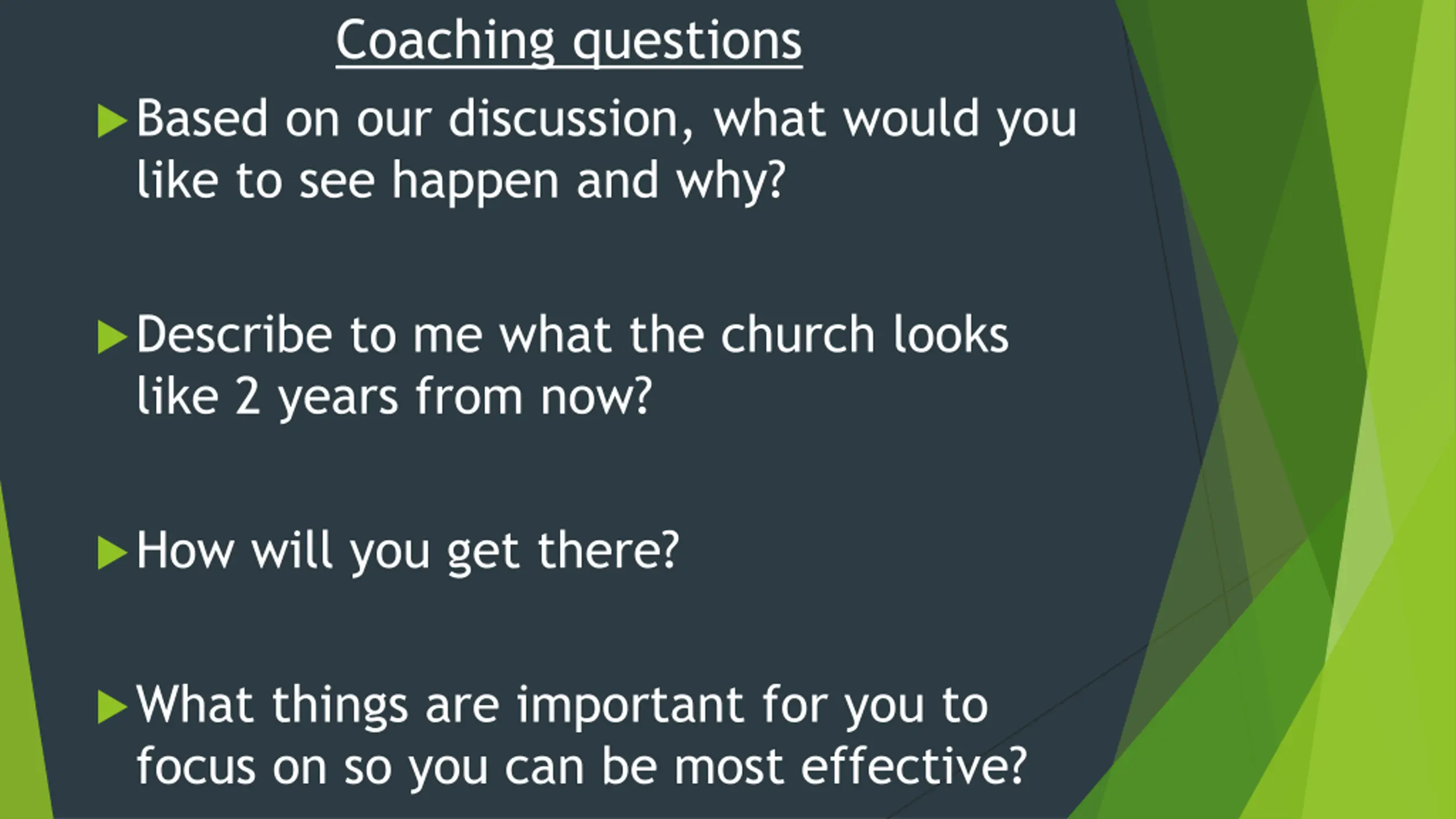 Coaching questions Based on our discussion, what would you like to see happen and why? Describe to me what the church looks like 2 years from now? How will you get there? What things are important for you to focus on so you can be most effective?