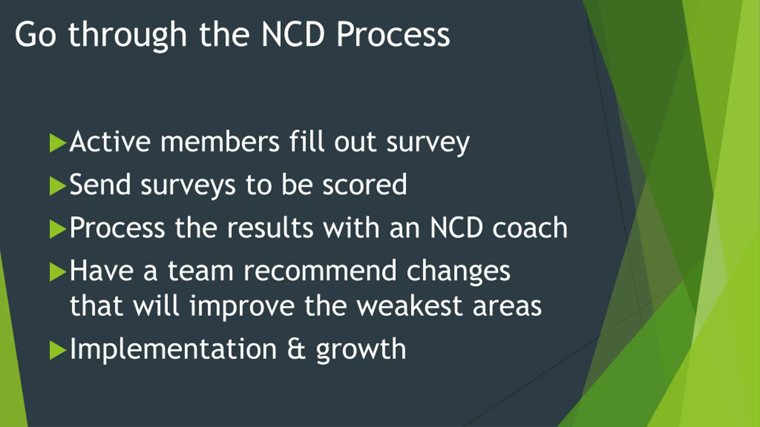 Go through the NCD Process Active members fill out survey Send surveys to be scored Process the results with an NCD coach Have a team recommend changes that will improve the weakest areas Implementation & growth