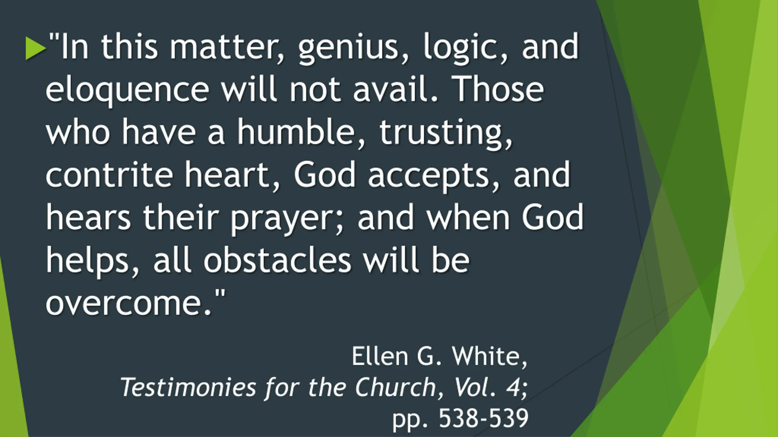 "In this matter, genius, logic, and eloquence will not avail. Those who have a humble, trusting, contrite heart, God accepts, and hears their prayer; and when God helps, all obstacles will be overcome." Ellen G. White, Testimonies for the Church, Vol. 4; pp. 538-539
