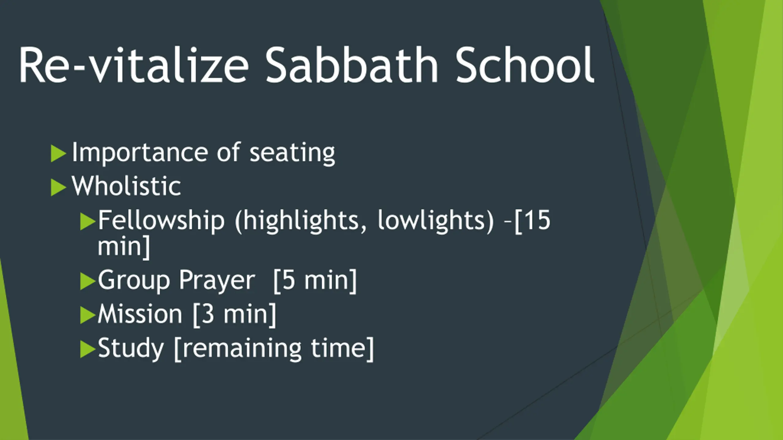 Re-vitalize Sabbath School Importance of seating Wholistic Fellowship (highlights, lowlights) [15 min] Group Prayer [5 min] Mission [3 min] Study [remaining time]