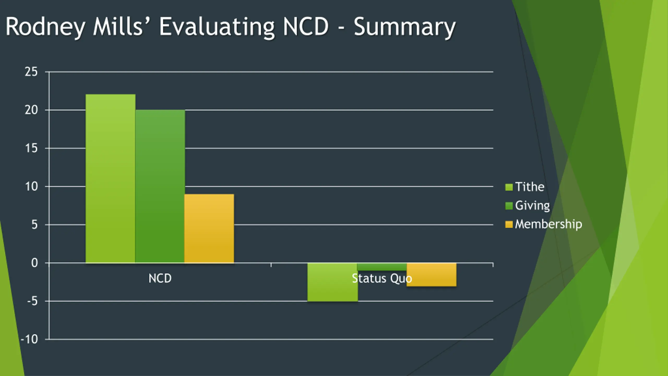 Rodney Mills Evaluating NCD - Summary 25 20 15 10 Tithe Giving Membership 5 0 NCD Status Quo -5 -10