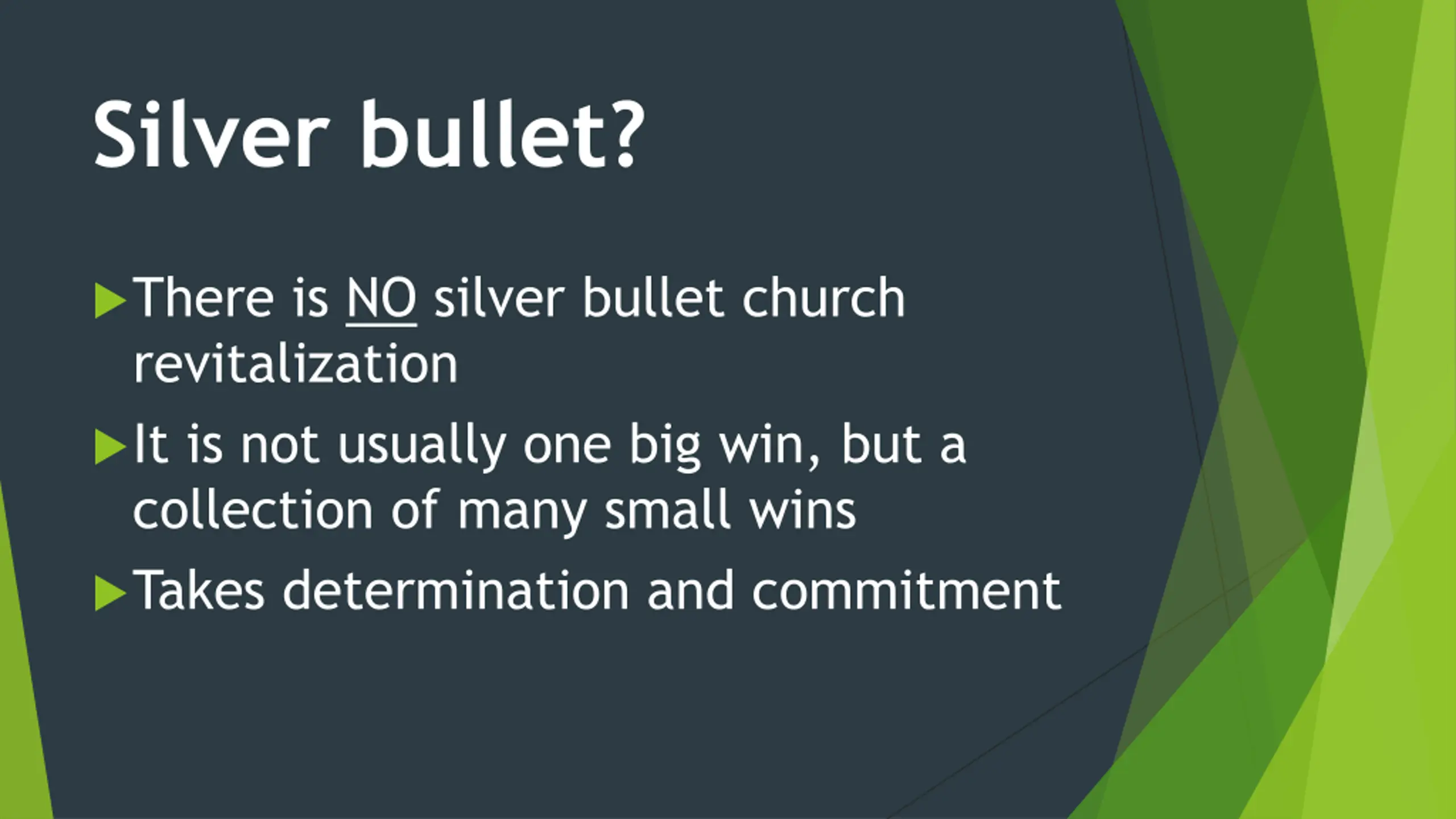 Silver bullet? There is NO silver bullet church revitalization It is not usually one big win, but a collection of many small wins Takes determination and commitment
