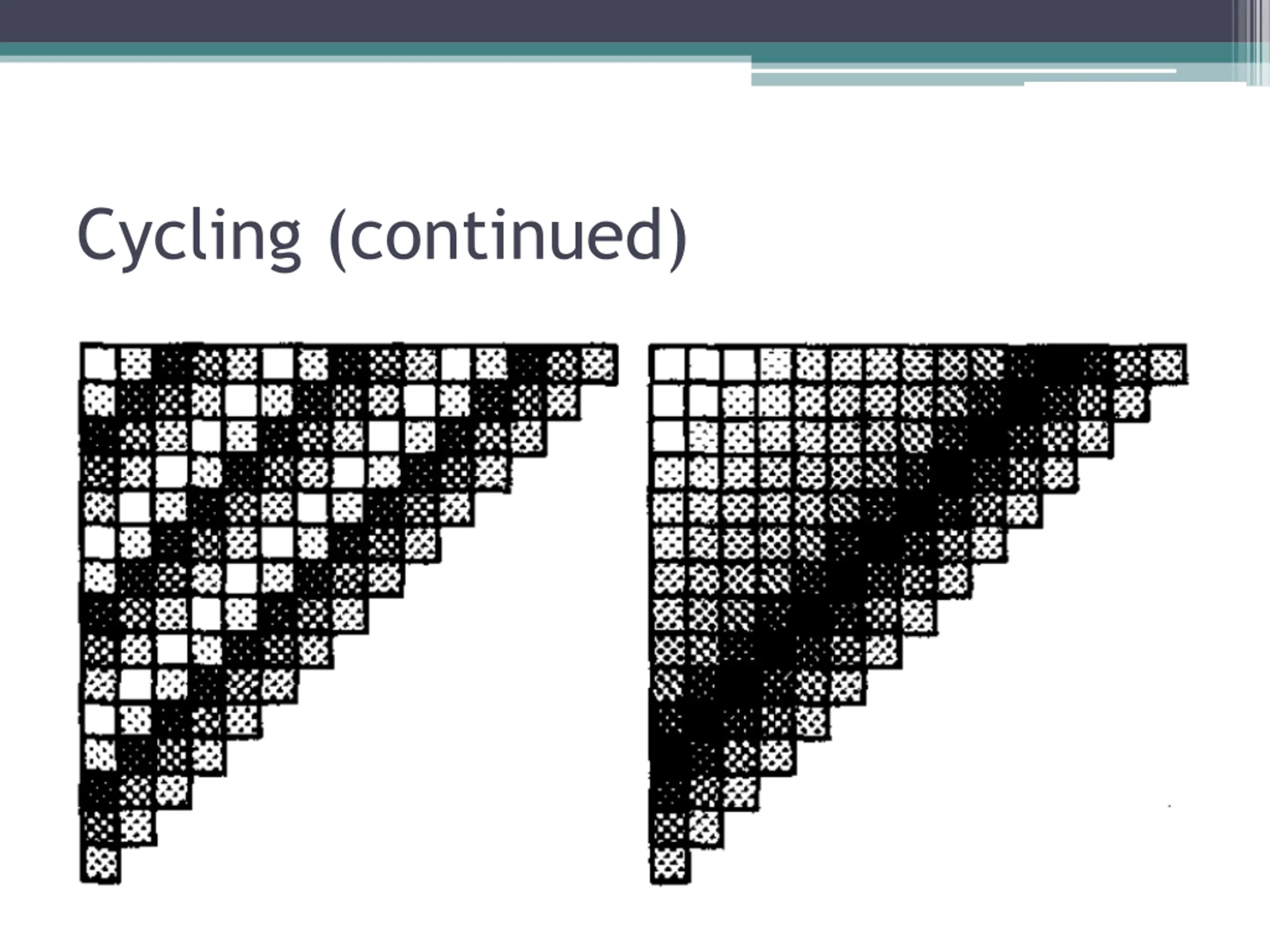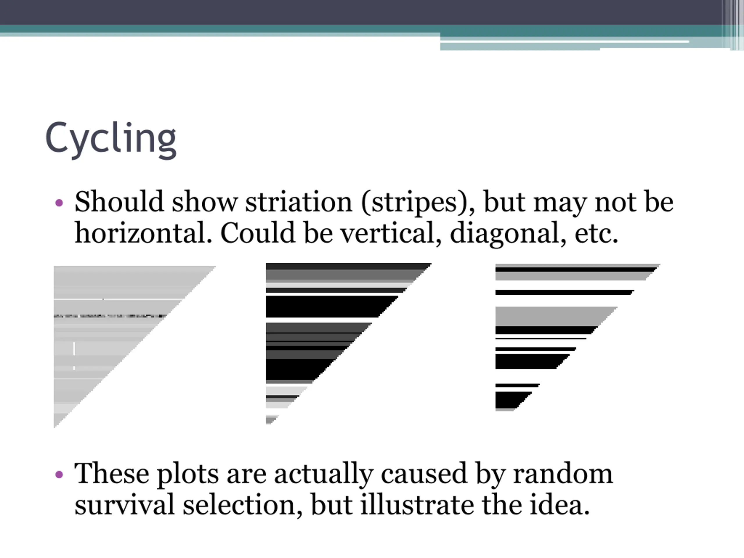 Cycling Should show striation (stripes), but may not be horizontal. Could be vertical, diagonal, etc. These plots are actually caused by random survival selection, but illustrate the idea.