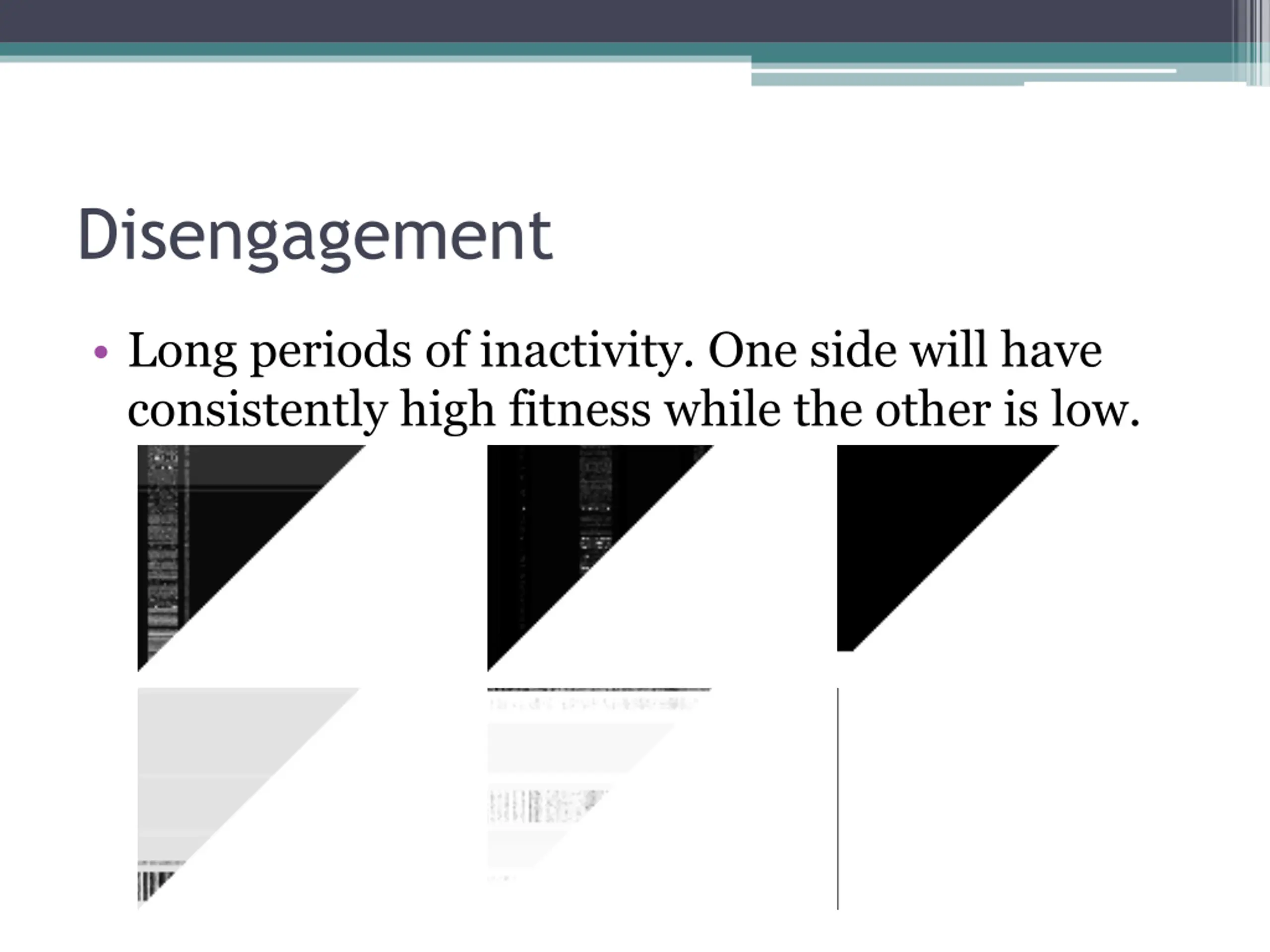 Disengagement Long periods of inactivity. One side will have consistently high fitness while the other is low.