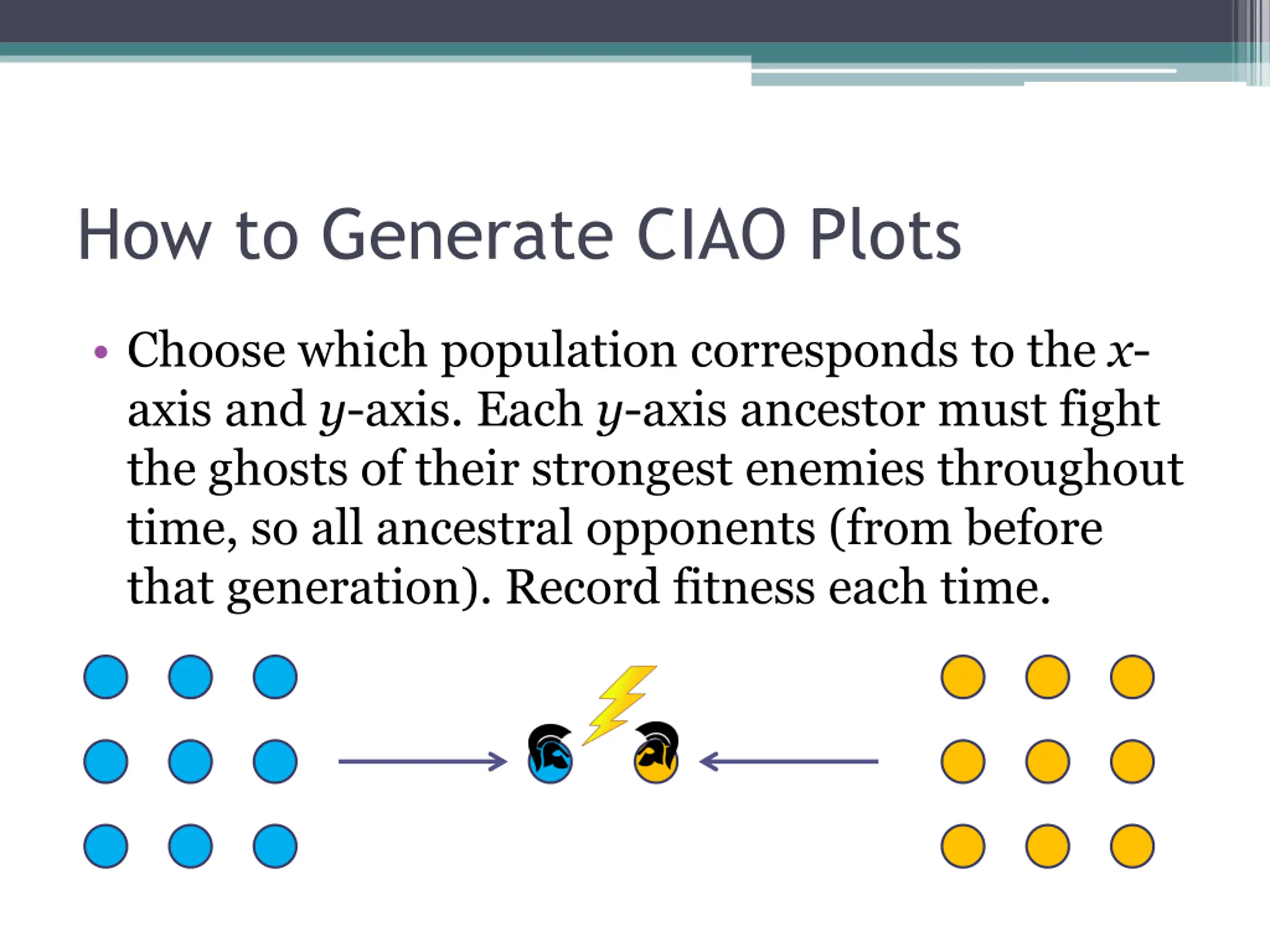 How to Generate CIAO Plots Choose which population corresponds to the x- axis and y-axis. Each y-axis ancestor must fight the ghosts of their strongest enemies throughout time, so all ancestral opponents (from before that generation). Record fitness each time.