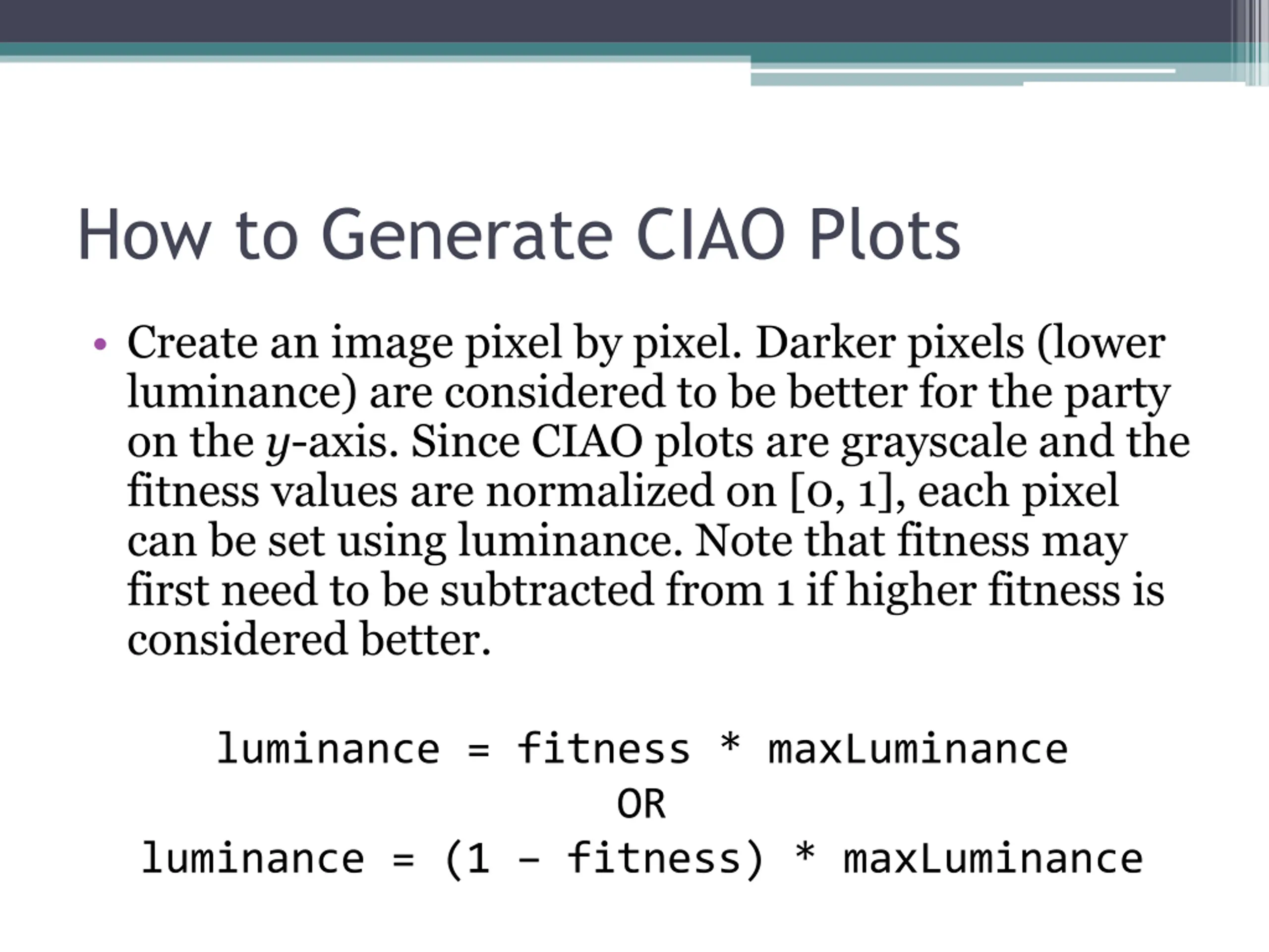 How to Generate CIAO Plots Create an image pixel by pixel. Darker pixels (lower luminance) are considered to be better for the party on the y-axis. Since CIAO plots are grayscale and the fitness values are normalized on [0, 1], each pixel can be set using luminance. Note that fitness may first need to be subtracted from 1 if higher fitness is considered better. luminance = fitness * maxLuminance OR luminance = (1 fitness) * maxLuminance