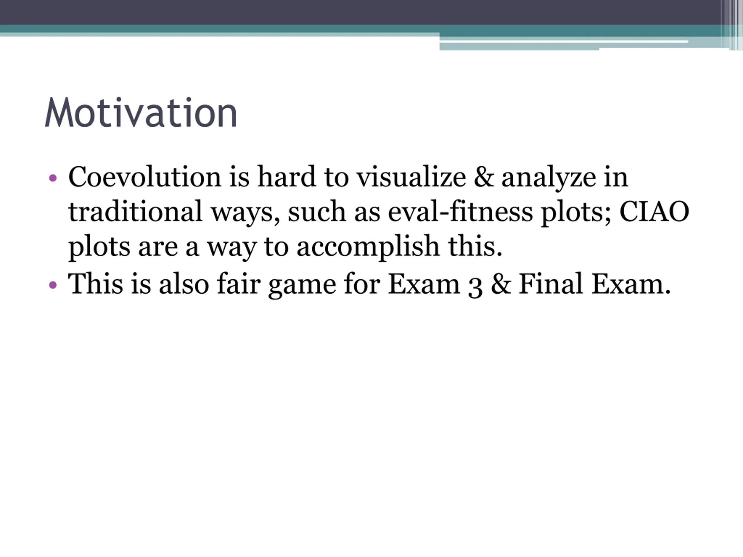 Motivation Coevolution is hard to visualize & analyze in traditional ways, such as eval-fitness plots; CIAO plots are a way to accomplish this. This is also fair game for Exam 3 & Final Exam.