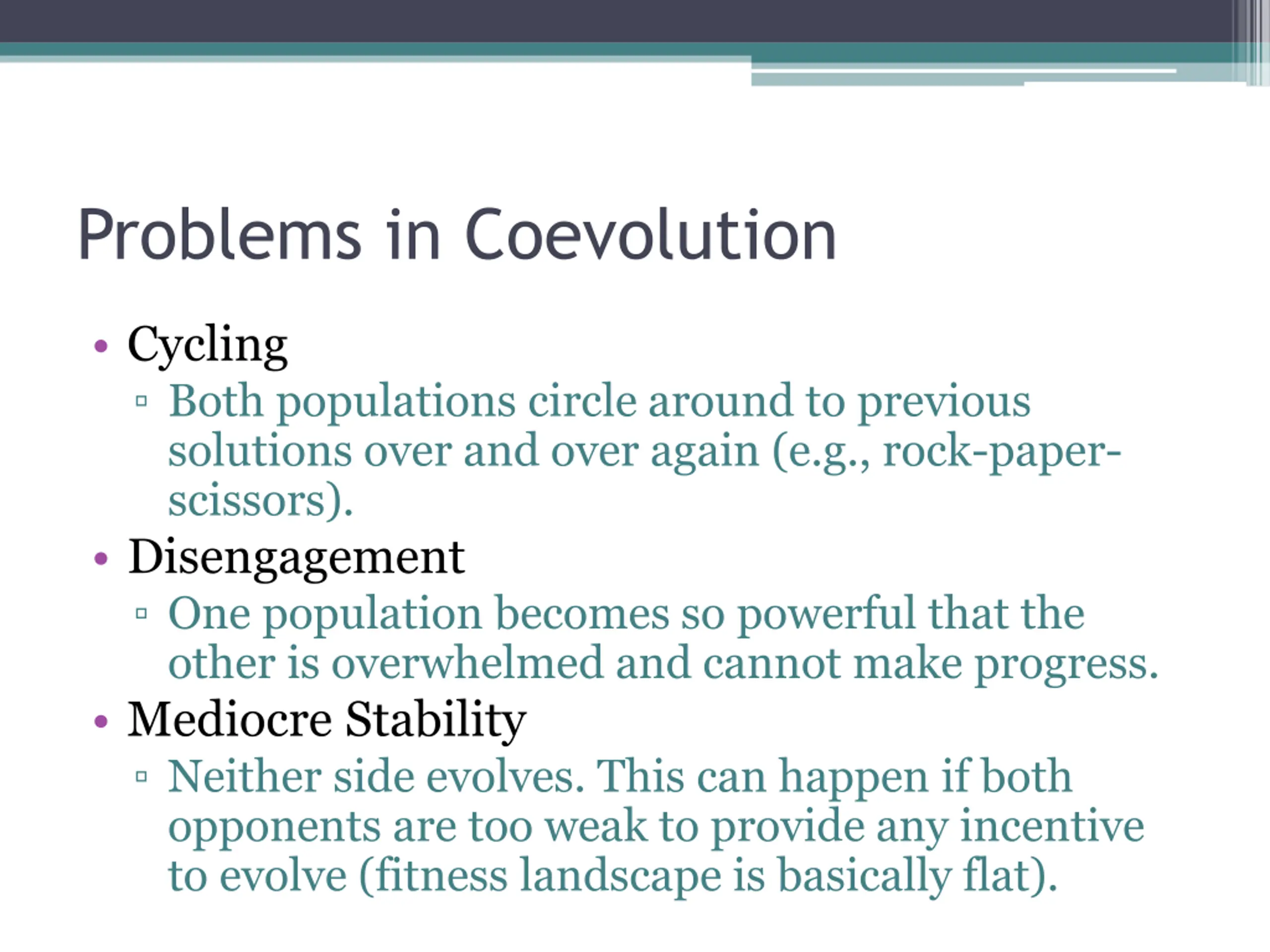 Problems in Coevolution Cycling Both populations circle around to previous solutions over and over again (e.g., rock-paper- scissors). Disengagement One population becomes so powerful that the other is overwhelmed and cannot make progress. Mediocre Stability Neither side evolves. This can happen if both opponents are too weak to provide any incentive to evolve (fitness landscape is basically flat).