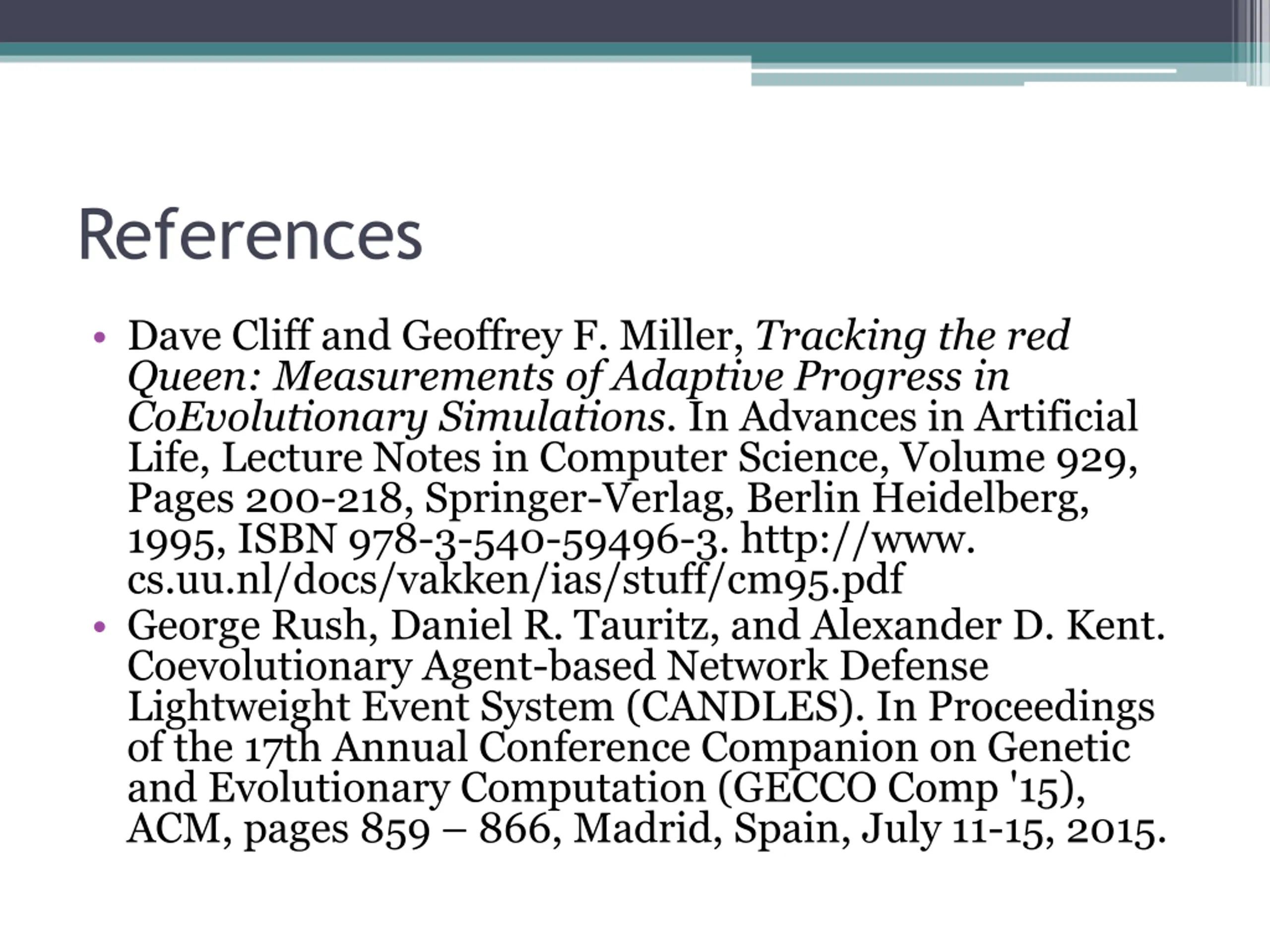 References Dave Cliff and Geoffrey F. Miller, Tracking the red Queen: Measurements of Adaptive Progress in CoEvolutionary Simulations. In Advances in Artificial Life, Lecture Notes in Computer Science, Volume 929, Pages 200-218, Springer-Verlag, Berlin Heidelberg, 1995, ISBN 978-3-540-59496-3. http://www. cs.uu.nl/docs/vakken/ias/stuff/cm95.pdf George Rush, Daniel R. Tauritz, and Alexander D. Kent. Coevolutionary Agent-based Network Defense Lightweight Event System (CANDLES). In Proceedings of the 17th Annual Conference Companion on Genetic and Evolutionary Computation (GECCO Comp '15), ACM, pages 859 866, Madrid, Spain, July 11-15, 2015.