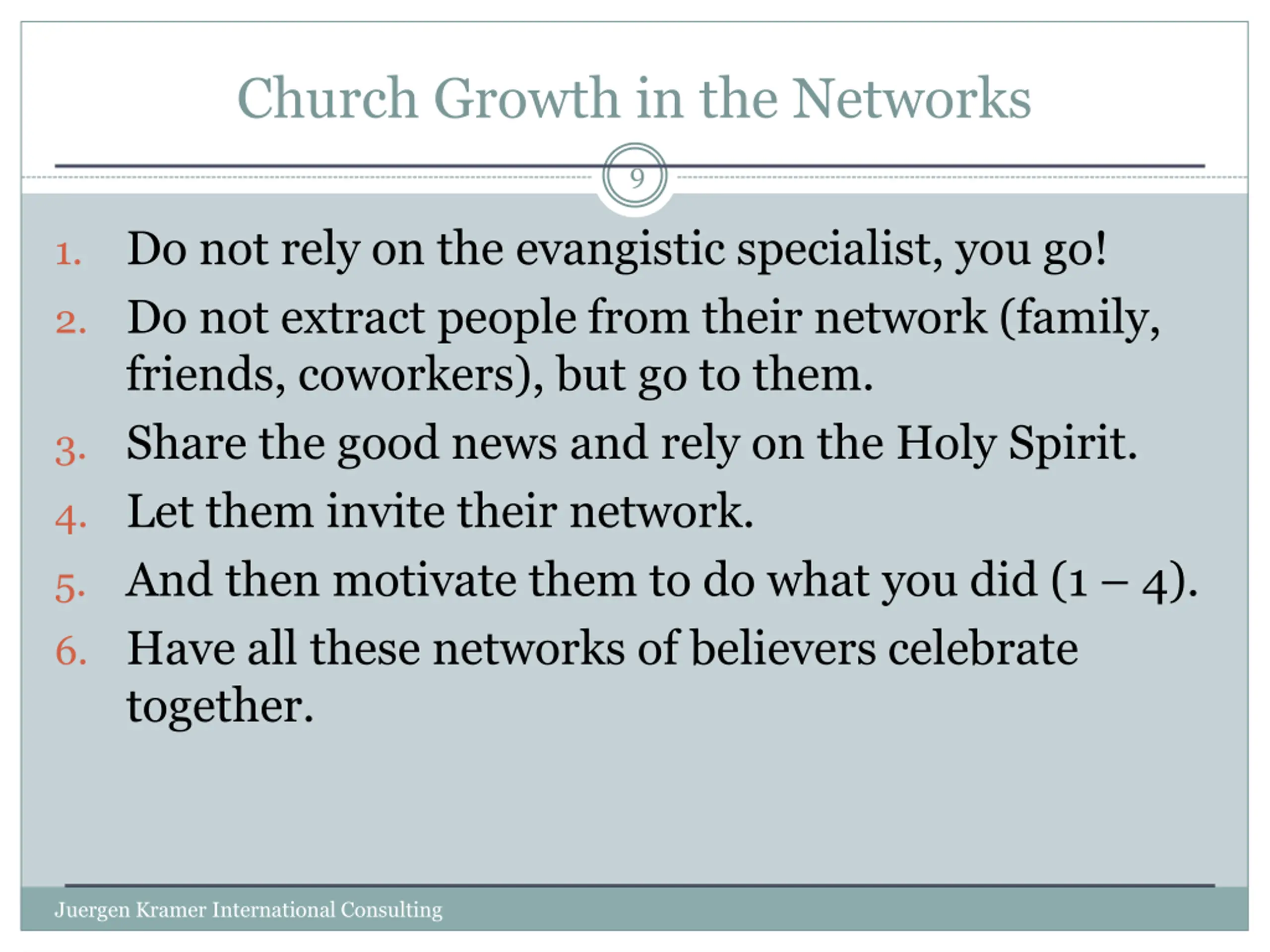 Church Growth in the Networks 9 Do not rely on the evangistic specialist, you go! 1. 2. Do not extract people from their network (family, friends, coworkers), but go to them. 3. Share the good news and rely on the Holy Spirit. 4. Let them invite their network. 5. And then motivate them to do what you did (1 4). 6. Have all these networks of believers celebrate together. Juergen Kramer International Consulting
