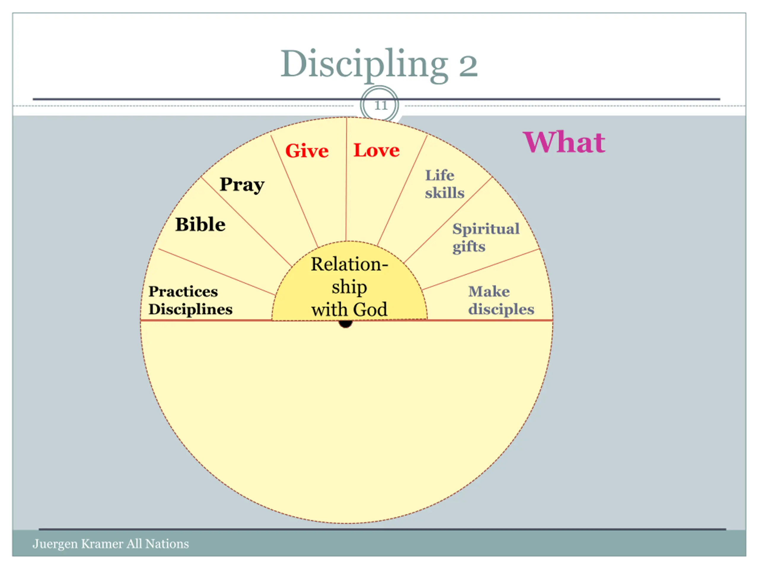 Discipling 2 11 What Love Give Life skills Pray Bible Spiritual gifts Relation- ship with God Practices Disciplines Make disciples W Juergen Kramer All Nations