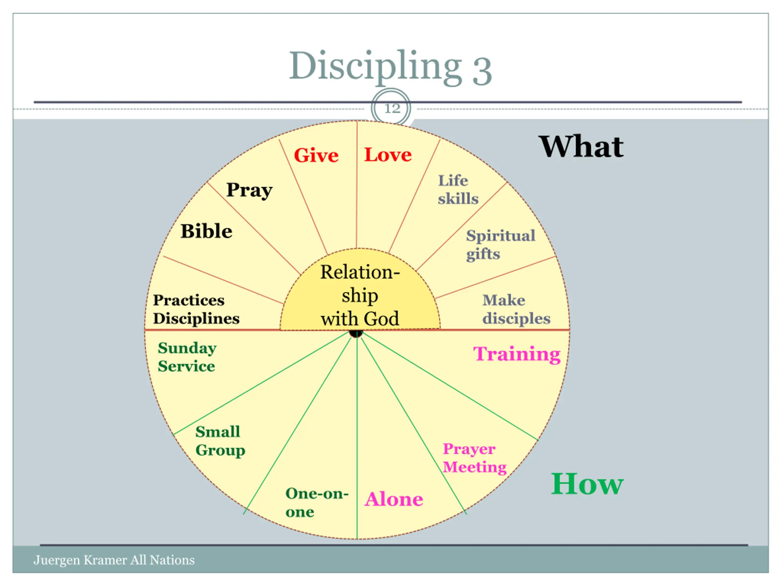 Discipling 3 12 What Love Give Life skills Pray Bible Spiritual gifts Relation- ship with God Practices Disciplines Make disciples W Sunday Service Training Small Group Prayer Meeting How One-on- one Alone Juergen Kramer All Nations