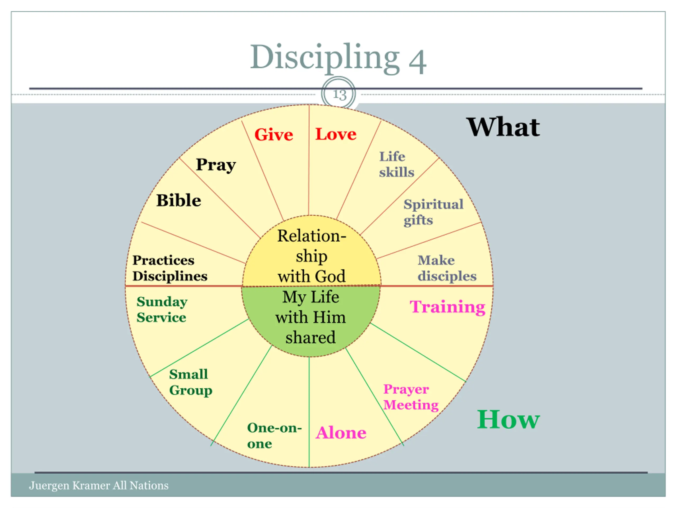 Discipling 4 13 What Love Give Life skills Pray Bible Spiritual gifts Relation- ship with God My Life with Him shared Practices Disciplines Make disciples W Sunday Service Training Small Group Prayer Meeting How One-on- one Alone Juergen Kramer All Nations