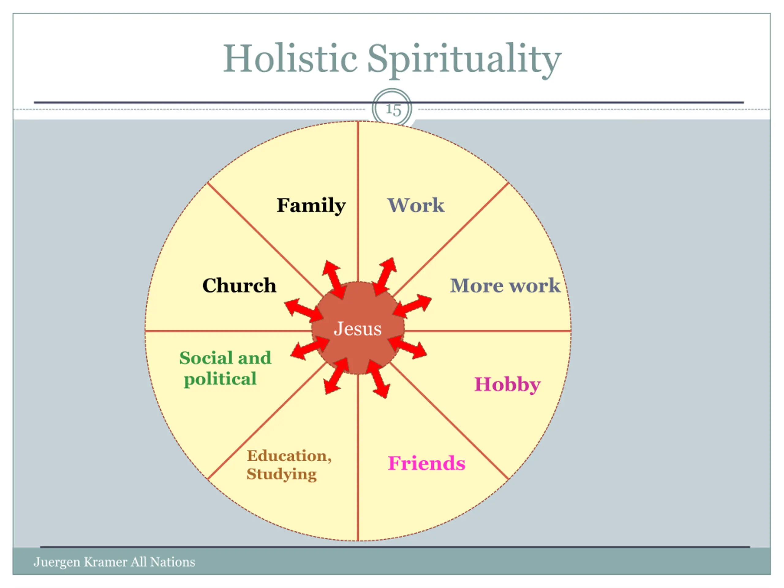 Holistic Spirituality 15 Family Work Church More work Jesus W Social and political Hobby Education, Studying Friends Juergen Kramer All Nations