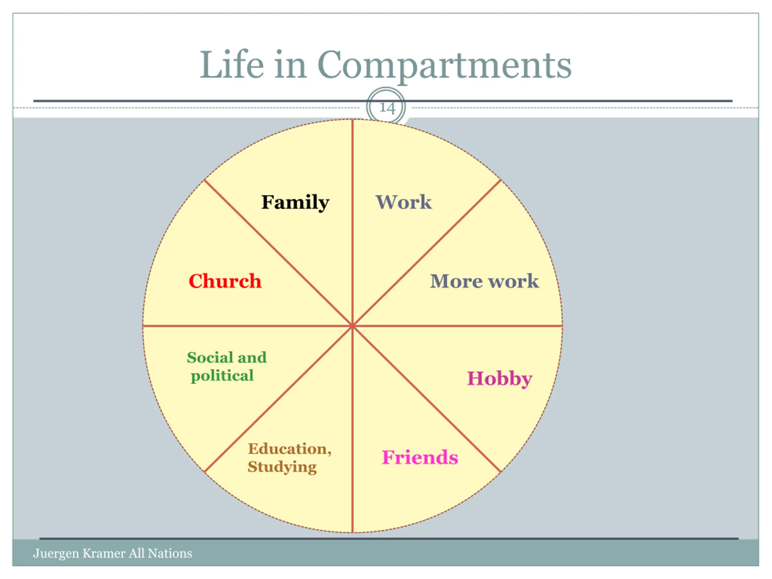 Life in Compartments 14 Family Work Church More work W Social and political Hobby Education, Studying Friends Juergen Kramer All Nations