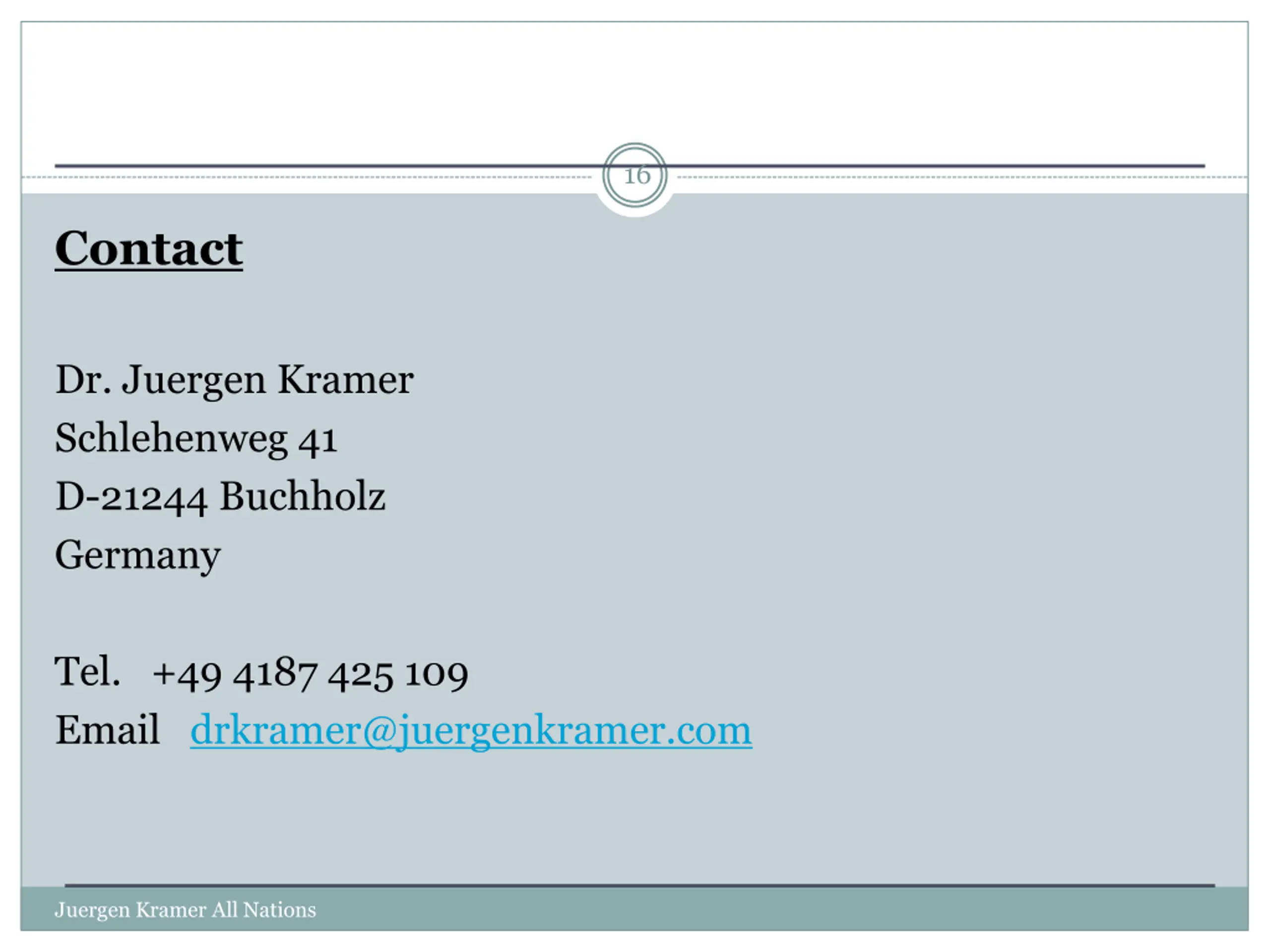 16 Contact Dr. Juergen Kramer Schlehenweg 41 D-21244 Buchholz Germany Tel. +49 4187 425 109 Email drkramer@juergenkramer.com Juergen Kramer All Nations