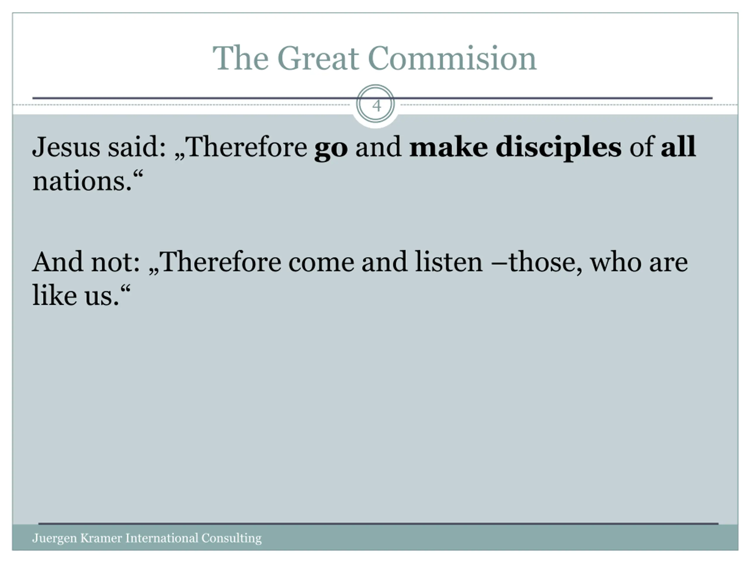 The Great Commision 4 Jesus said: Therefore go and make disciples of all nations. And not: Therefore come and listen those, who are like us. Juergen Kramer International Consulting
