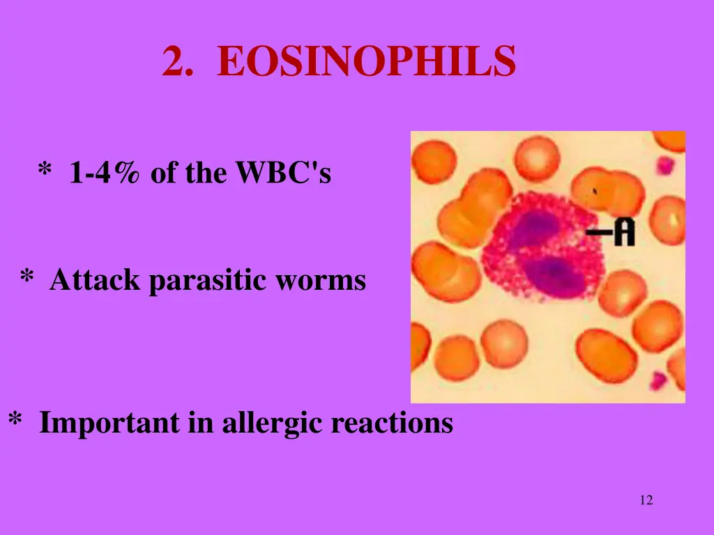 2. EOSINOPHILS * 1-4% of the WBC's * Attack parasitic worms * Important in allergic reactions 12