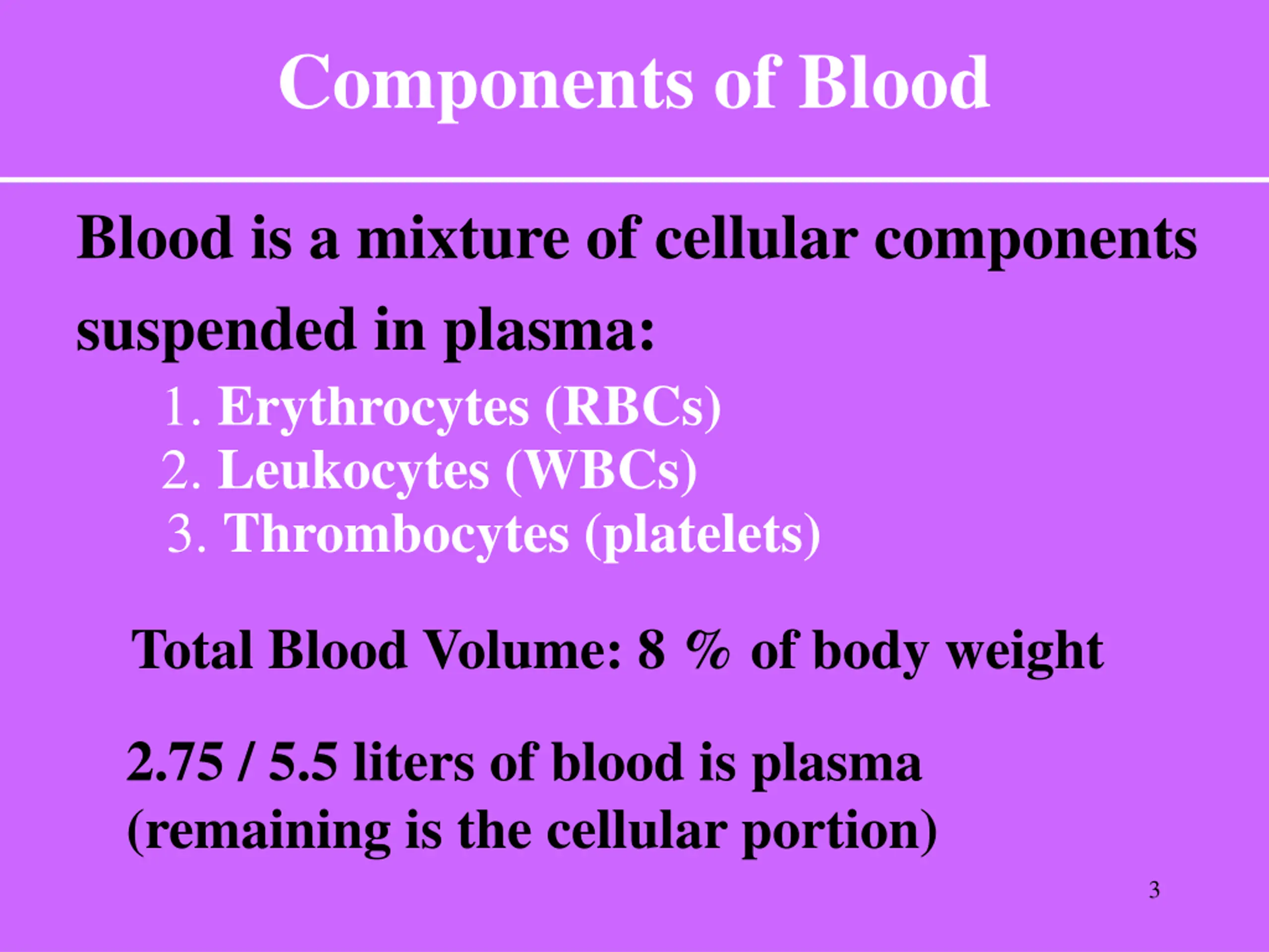 Components of Blood Blood is a mixture of cellular components suspended in plasma: 1. Erythrocytes (RBCs) 2. Leukocytes (WBCs) 3. Thrombocytes (platelets) Total Blood Volume: 8 % of body weight 2.75 / 5.5 liters of blood is plasma (remaining is the cellular portion) 3