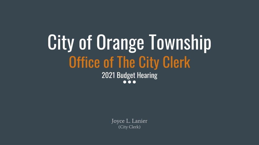 "Explore the City Clerk's Office of Orange Township, focusing on the 2021 budget hearing and operational excellence. Learn about their mission, services, and achievements, including a redesigned records management program. Discover how they ensure transparency, compliance, and efficiency in serving the public."