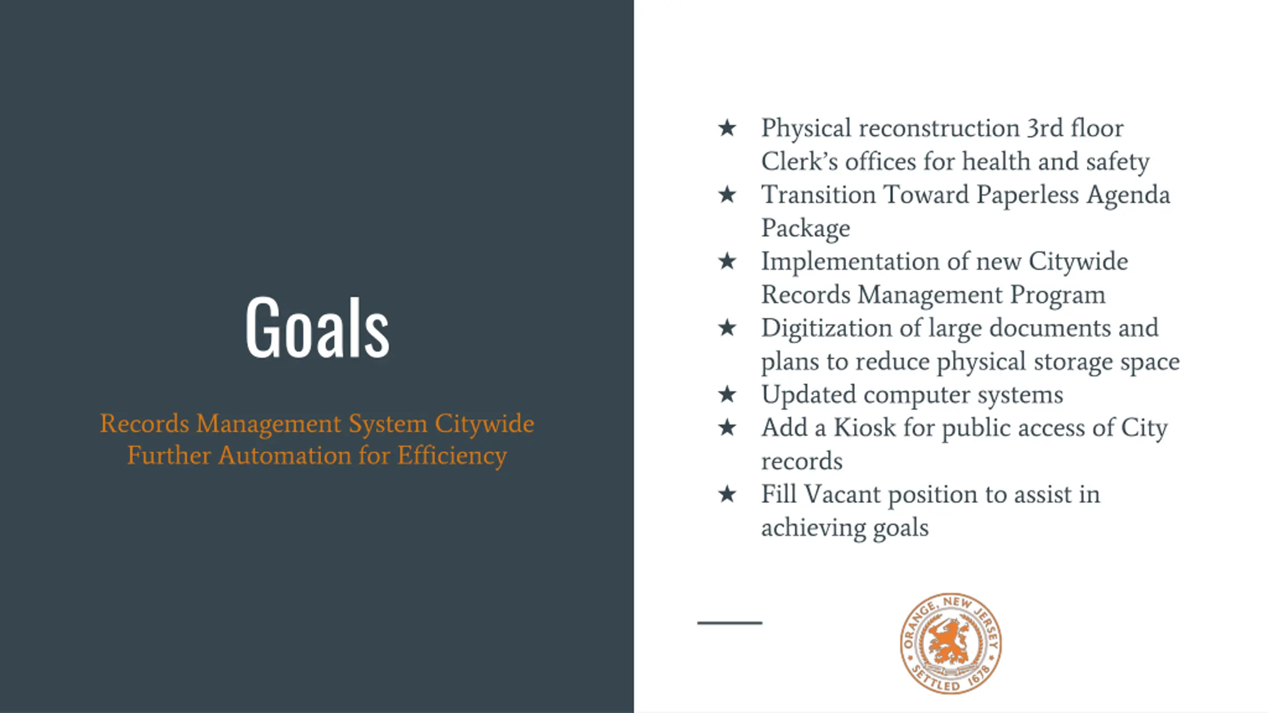 Physical reconstruction 3rd floor Clerk s offices for health and safety Transition Toward Paperless Agenda Package Implementation of new Citywide Records Management Program Digitization of large documents and plans to reduce physical storage space Updated computer systems Add a Kiosk for public access of City records Fill Vacant position to assist in achieving goals Goals Records Management System Citywide Further Automation for Efficiency