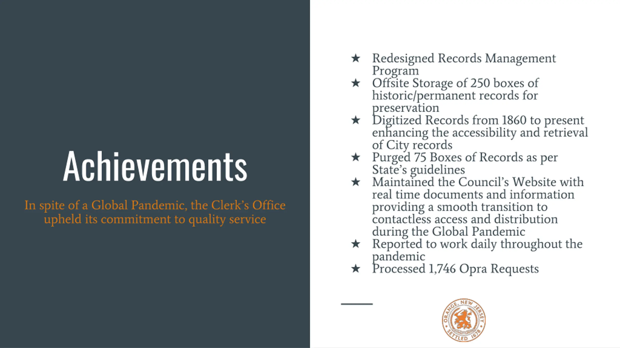 Redesigned Records Management Program Offsite Storage of 250 boxes of historic/permanent records for preservation Digitized Records from 1860 to present enhancing the accessibility and retrieval of City records Purged 75 Boxes of Records as per State s guidelines Maintained the Council s Website with real time documents and information providing a smooth transition to contactless access and distribution during the Global Pandemic Reported to work daily throughout the pandemic Processed 1,746 Opra Requests Achievements In spite of a Global Pandemic, the Clerk s Office upheld its commitment to quality service