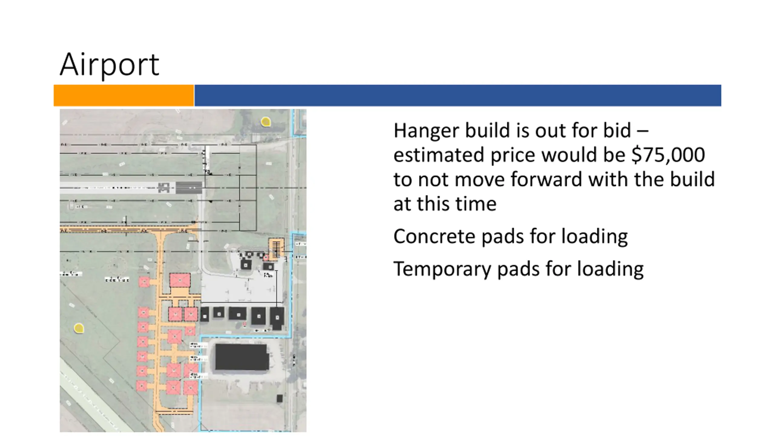 Airport Hanger build is out for bid estimated price would be $75,000 to not move forward with the build at this time Concrete pads for loading Temporary pads for loading