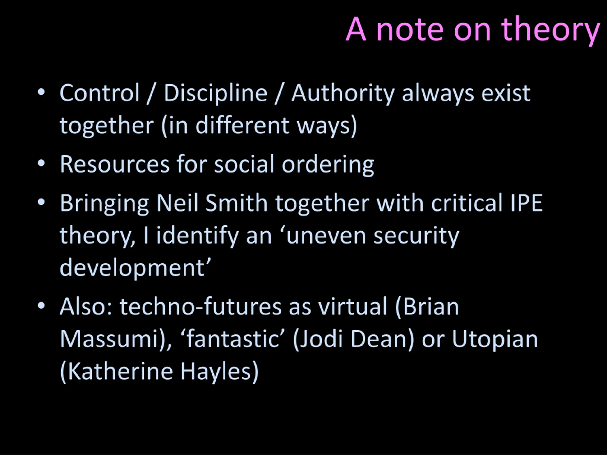 A note on theory Control / Discipline / Authority always exist together (in different ways) Resources for social ordering Bringing Neil Smith together with critical IPE theory, I identify an uneven security development Also: techno-futures as virtual (Brian Massumi), fantastic (Jodi Dean) or Utopian (Katherine Hayles)