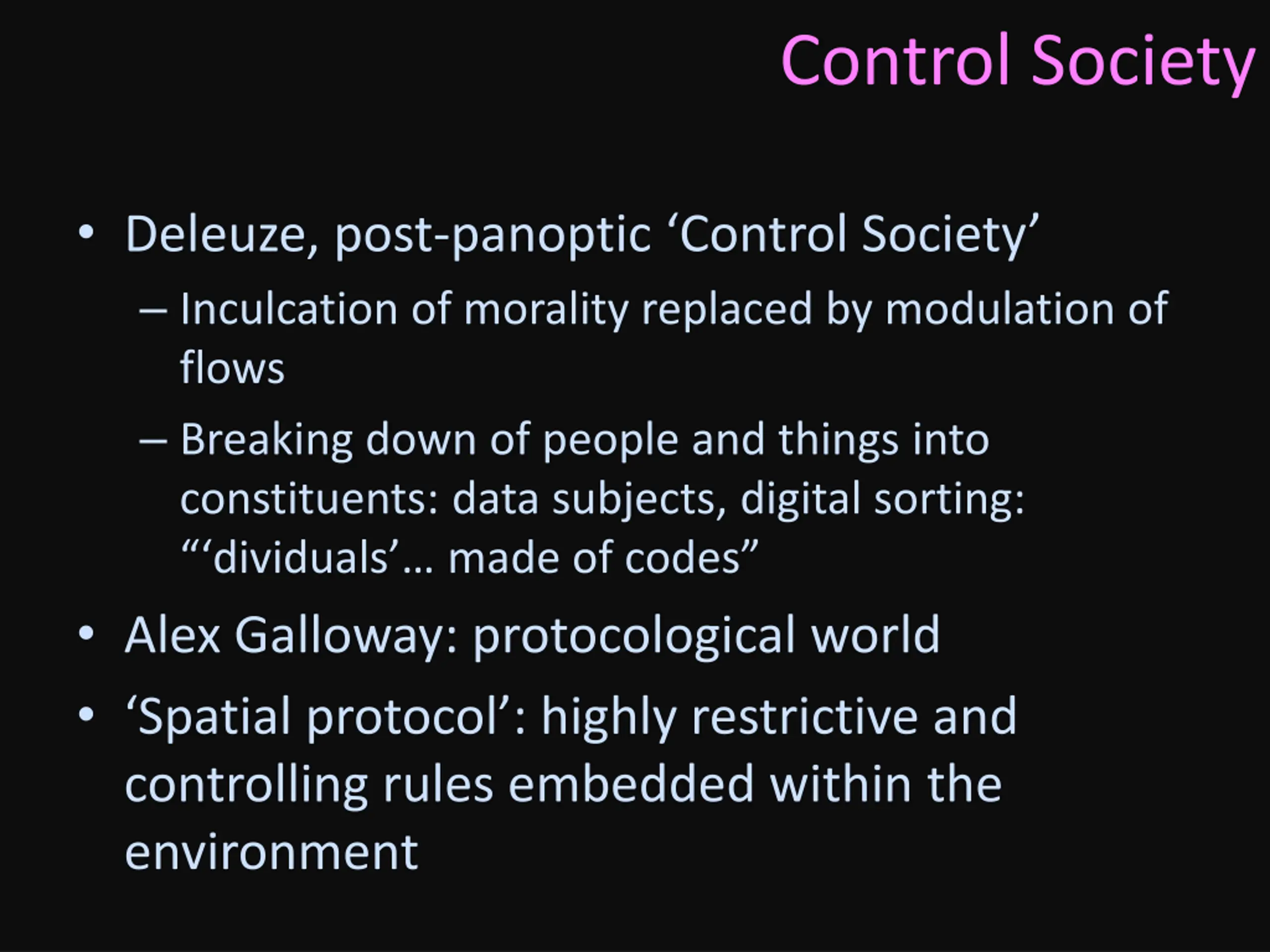 Control Society Deleuze, post-panoptic Control Society Inculcation of morality replaced by modulation of flows Breaking down of people and things into constituents: data subjects, digital sorting: dividuals made of codes Alex Galloway: protocological world Spatial protocol : highly restrictive and controlling rules embedded within the environment