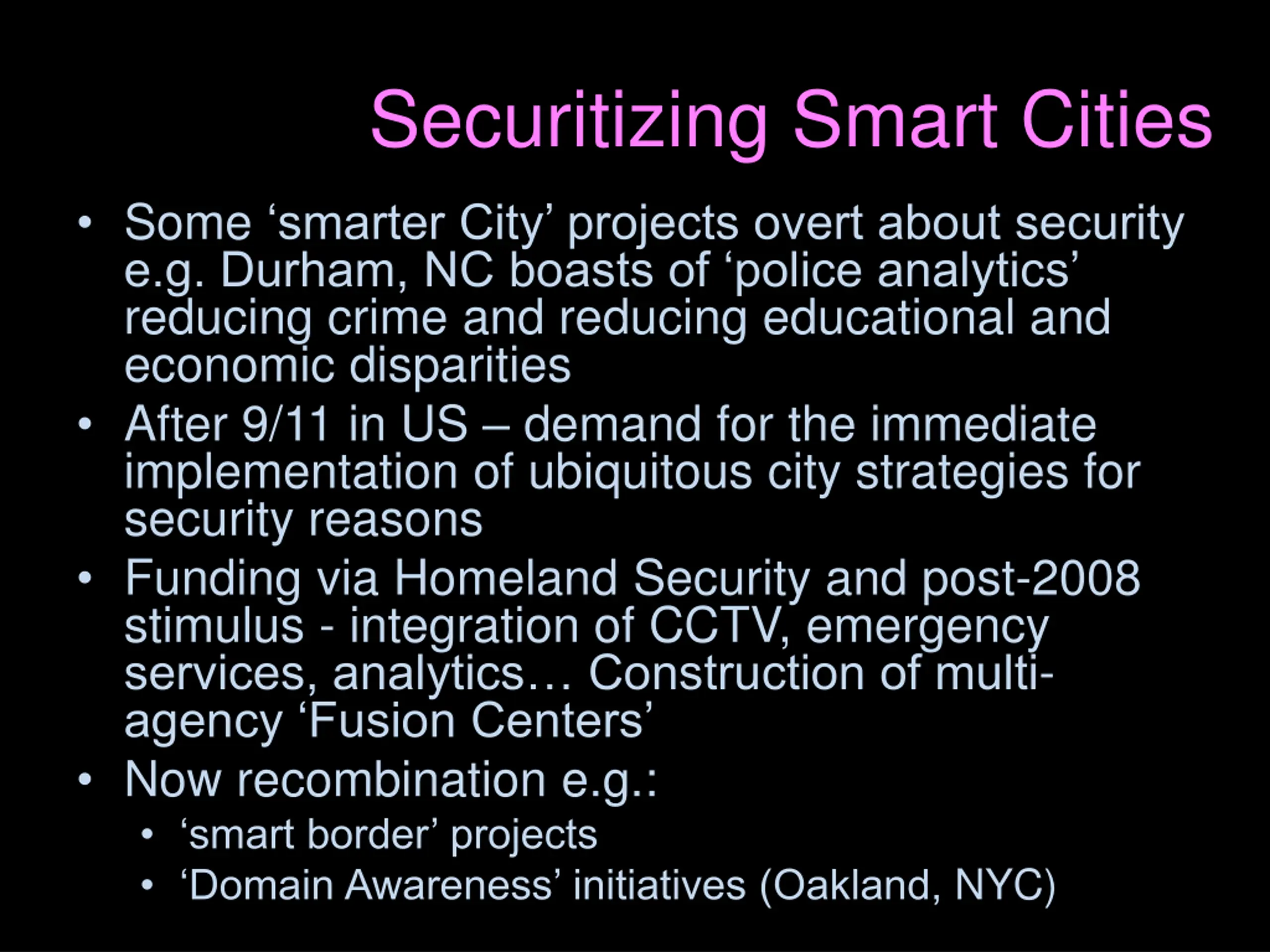 Securitizing Smart Cities Some smarter City projects overt about security e.g. Durham, NC boasts of police analytics reducing crime and reducing educational and economic disparities After 9/11 in US demand for the immediate implementation of ubiquitous city strategies for security reasons Funding via Homeland Security and post-2008 stimulus - integration of CCTV, emergency services, analytics Construction of multi- agency Fusion Centers Now recombination e.g.: smart border projects Domain Awareness initiatives (Oakland, NYC)