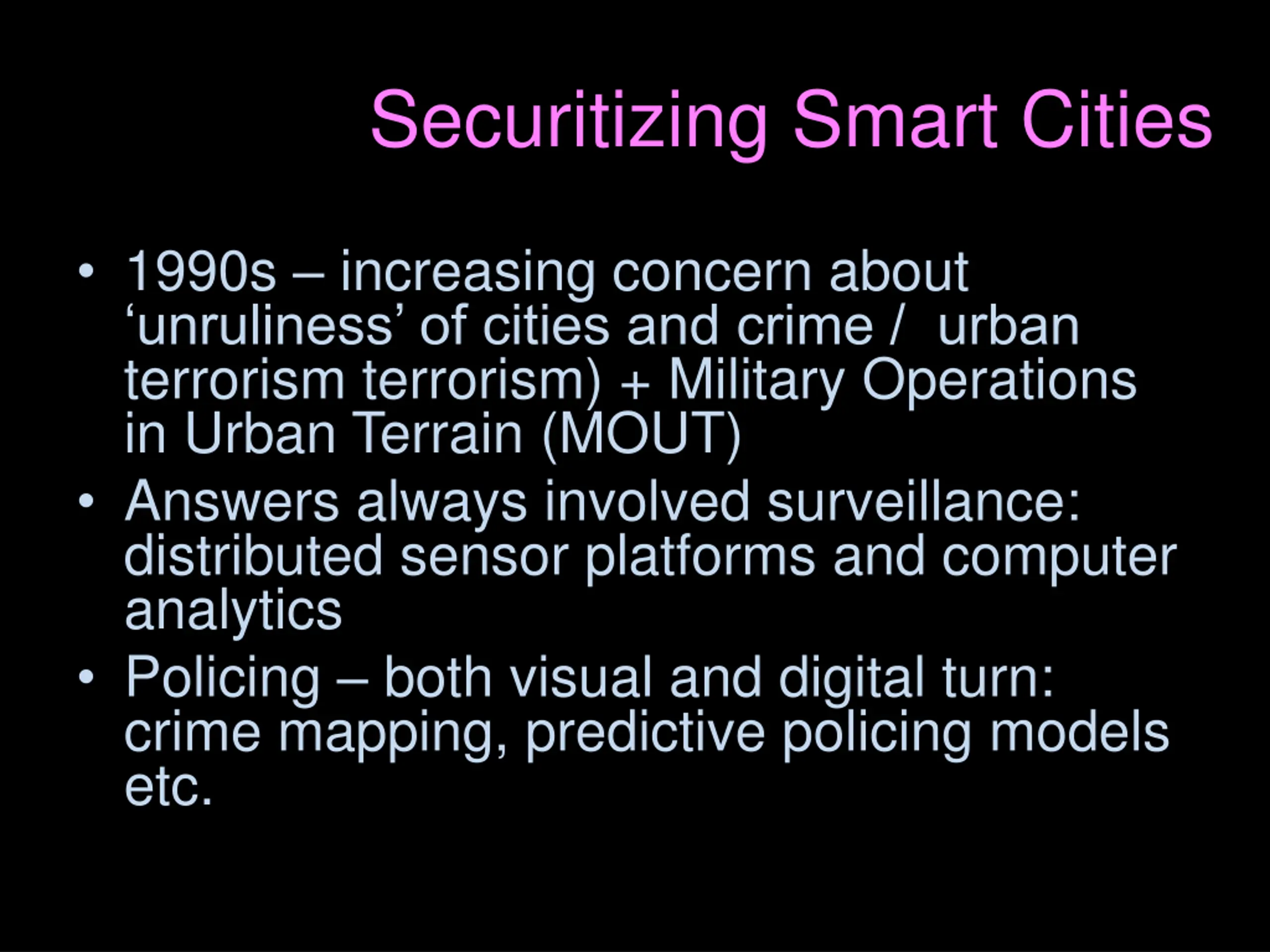 Securitizing Smart Cities 1990s increasing concern about unruliness of cities and crime / urban terrorism terrorism) + Military Operations in Urban Terrain (MOUT) Answers always involved surveillance: distributed sensor platforms and computer analytics Policing both visual and digital turn: crime mapping, predictive policing models etc.