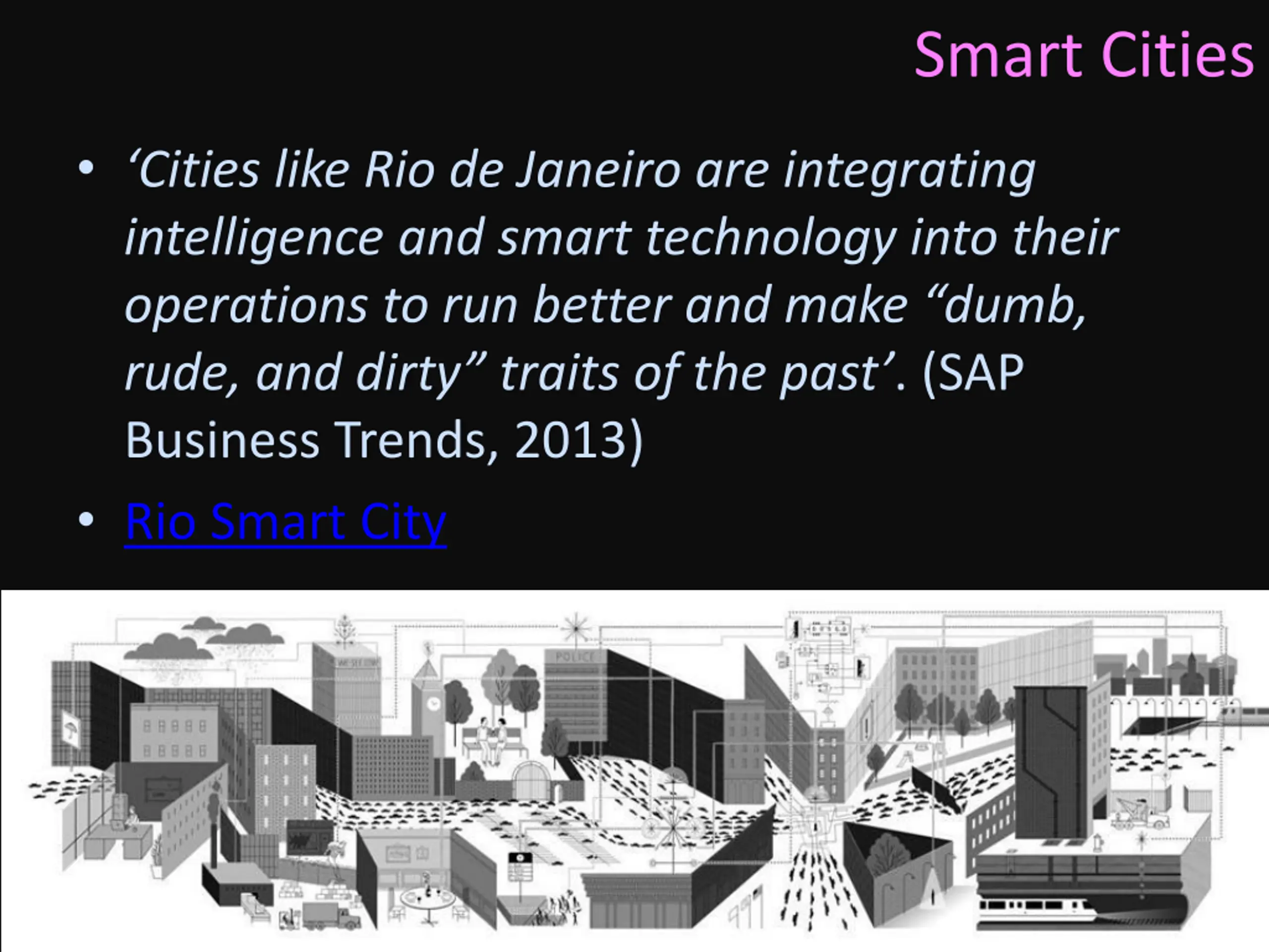 Smart Cities Cities like Rio de Janeiro are integrating intelligence and smart technology into their operations to run better and make dumb, rude, and dirty traits of the past . (SAP Business Trends, 2013) Rio Smart City