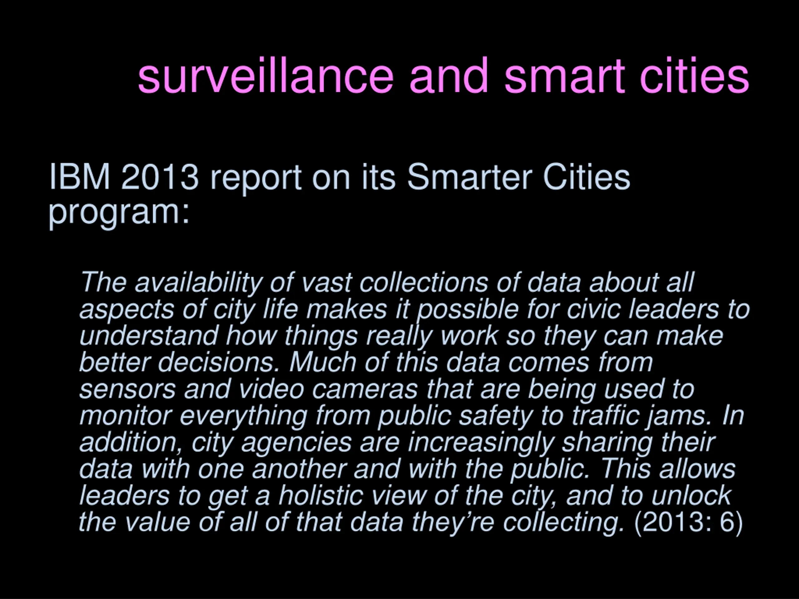 surveillance and smart cities IBM 2013 report on its Smarter Cities program: The availability of vast collections of data about all aspects of city life makes it possible for civic leaders to understand how things really work so they can make better decisions. Much of this data comes from sensors and video cameras that are being used to monitor everything from public safety to traffic jams. In addition, city agencies are increasingly sharing their data with one another and with the public. This allows leaders to get a holistic view of the city, and to unlock the value of all of that data they re collecting. (2013: 6)