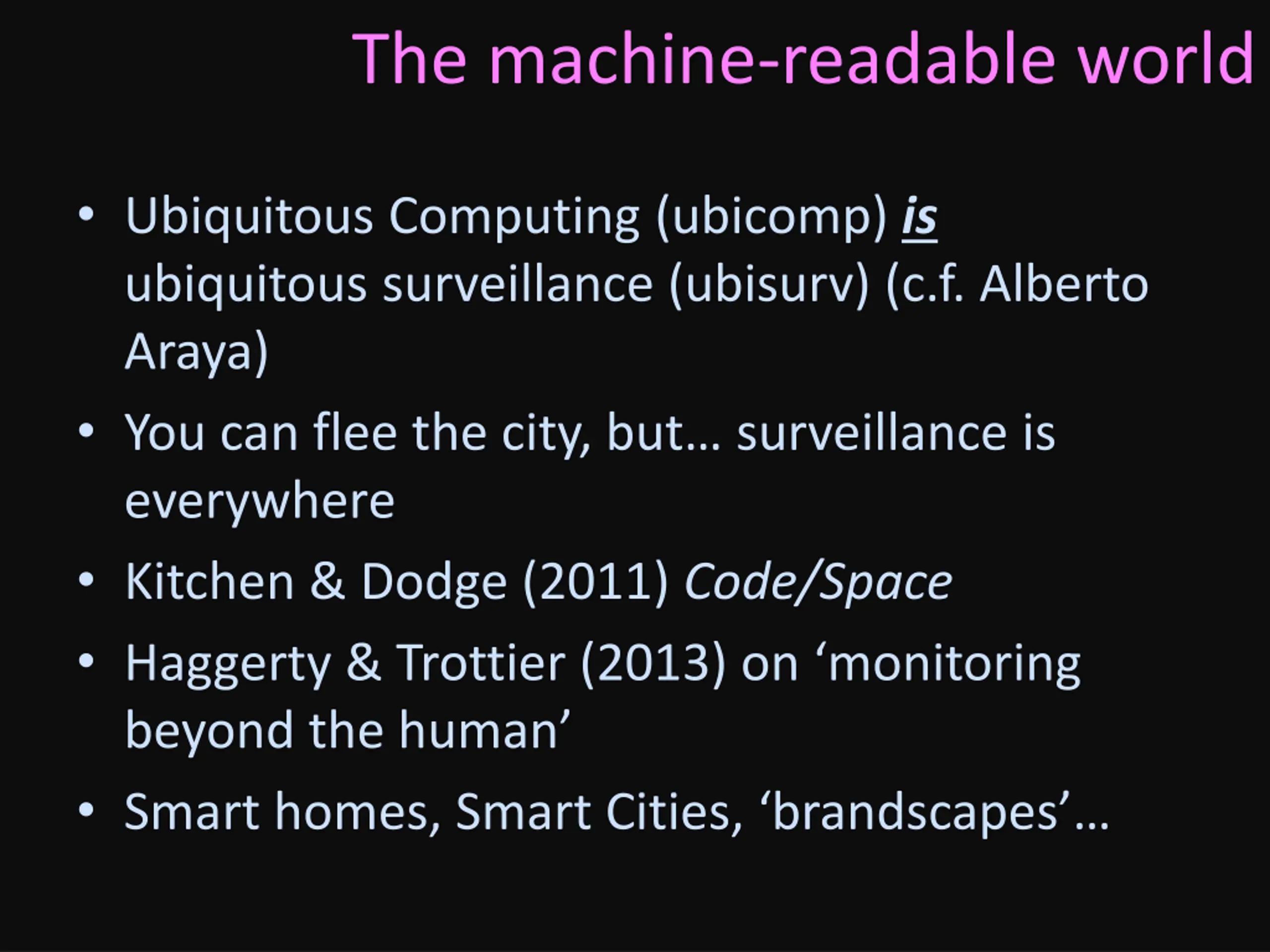 The machine-readable world Ubiquitous Computing (ubicomp) is ubiquitous surveillance (ubisurv) (c.f. Alberto Araya) You can flee the city, but surveillance is everywhere Kitchen & Dodge (2011) Code/Space Haggerty & Trottier (2013) on monitoring beyond the human Smart homes, Smart Cities, brandscapes