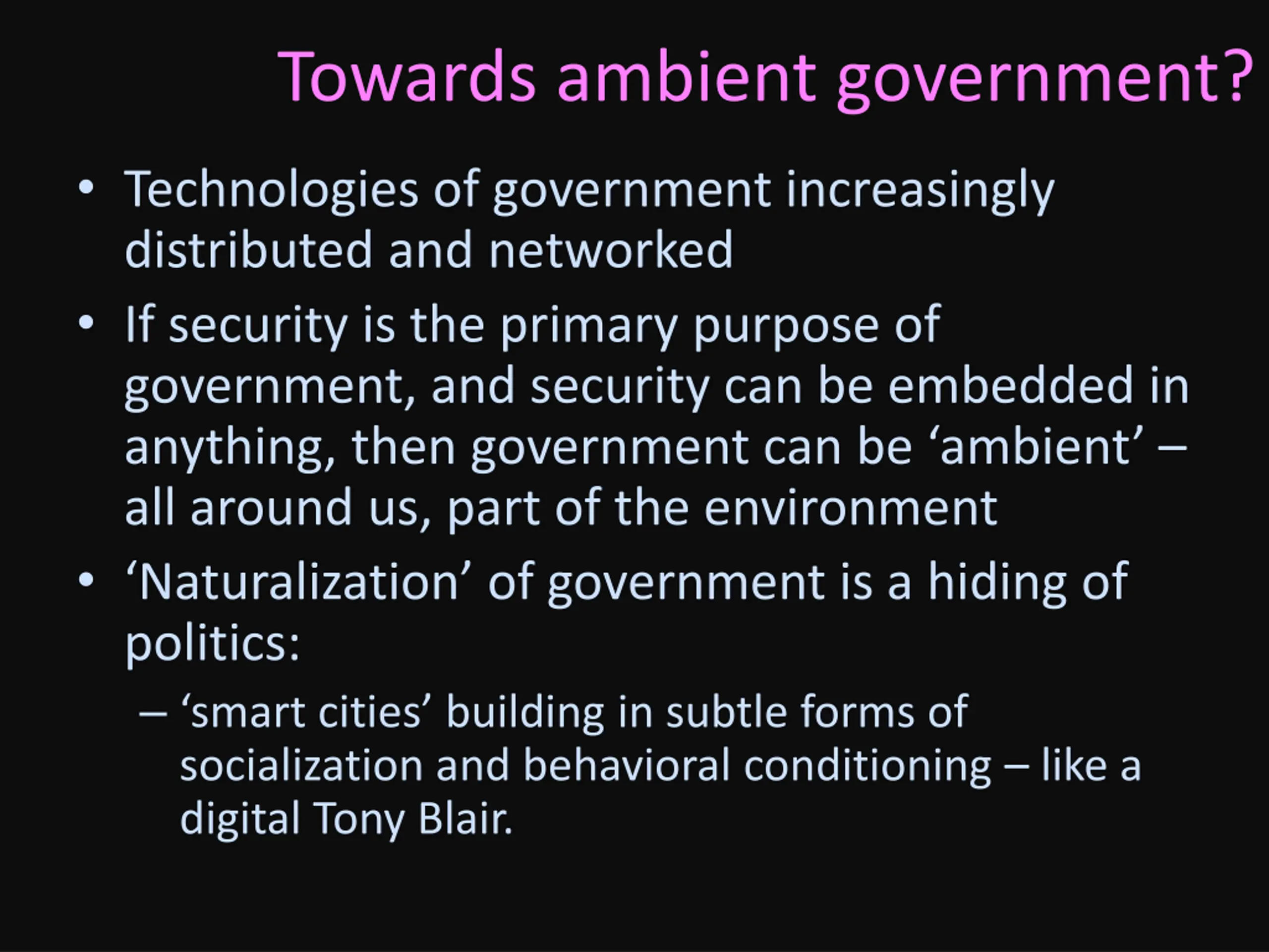 Towards ambient government? Technologies of government increasingly distributed and networked If security is the primary purpose of government, and security can be embedded in anything, then government can be ambient all around us, part of the environment Naturalization of government is a hiding of politics: smart cities building in subtle forms of socialization and behavioral conditioning like a digital Tony Blair.