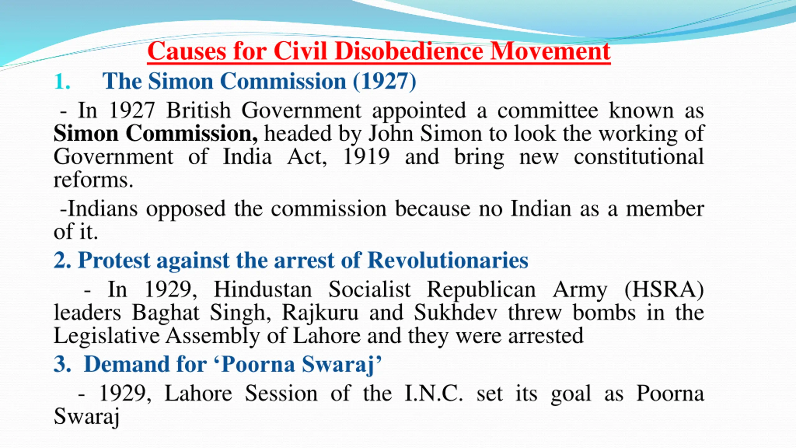 Causes for Civil Disobedience Movement The Simon Commission (1927) - In 1927 British Government appointed a committee known as Simon Commission, headed by John Simon to look the working of Government of India Act, 1919 and bring new constitutional reforms. -Indians opposed the commission because no Indian as a member of it. 2. Protest against the arrest of Revolutionaries - In 1929, Hindustan Socialist Republican Army (HSRA) leaders Baghat Singh, Rajkuru and Sukhdev threw bombs in the LegislativeAssembly of Lahore and they were arrested 3. Demand for Poorna Swaraj - 1929, Lahore Session of the I.N.C. set its goal as Poorna Swaraj 1.