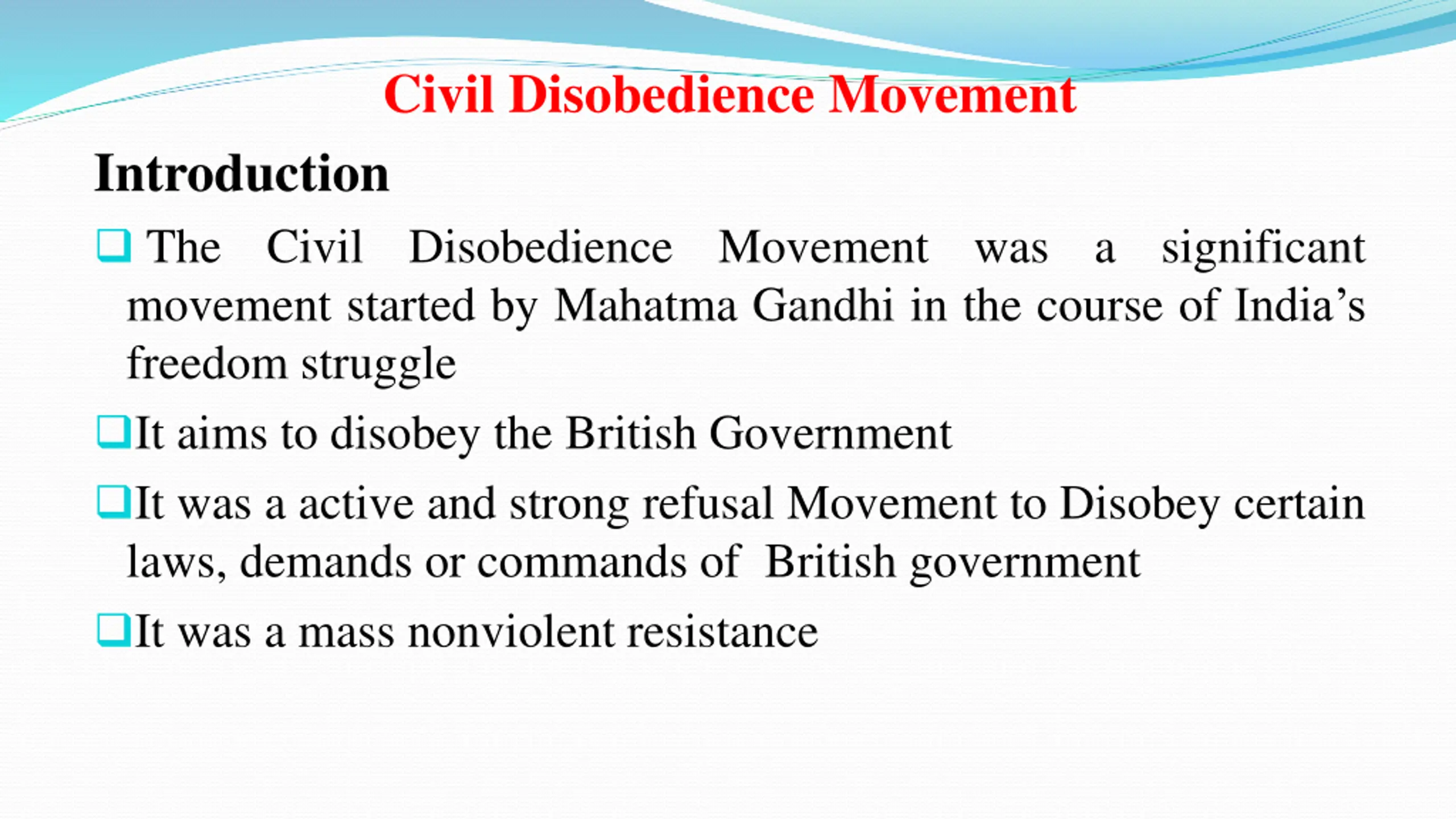 Civil Disobedience Movement Introduction The Civil Disobedience movement started by Mahatma Gandhi in the course of India s freedom struggle It aims to disobey the British Government It was a active and strong refusal Movement to Disobey certain laws, demands or commands of British government It was a mass nonviolent resistance Movement was a significant