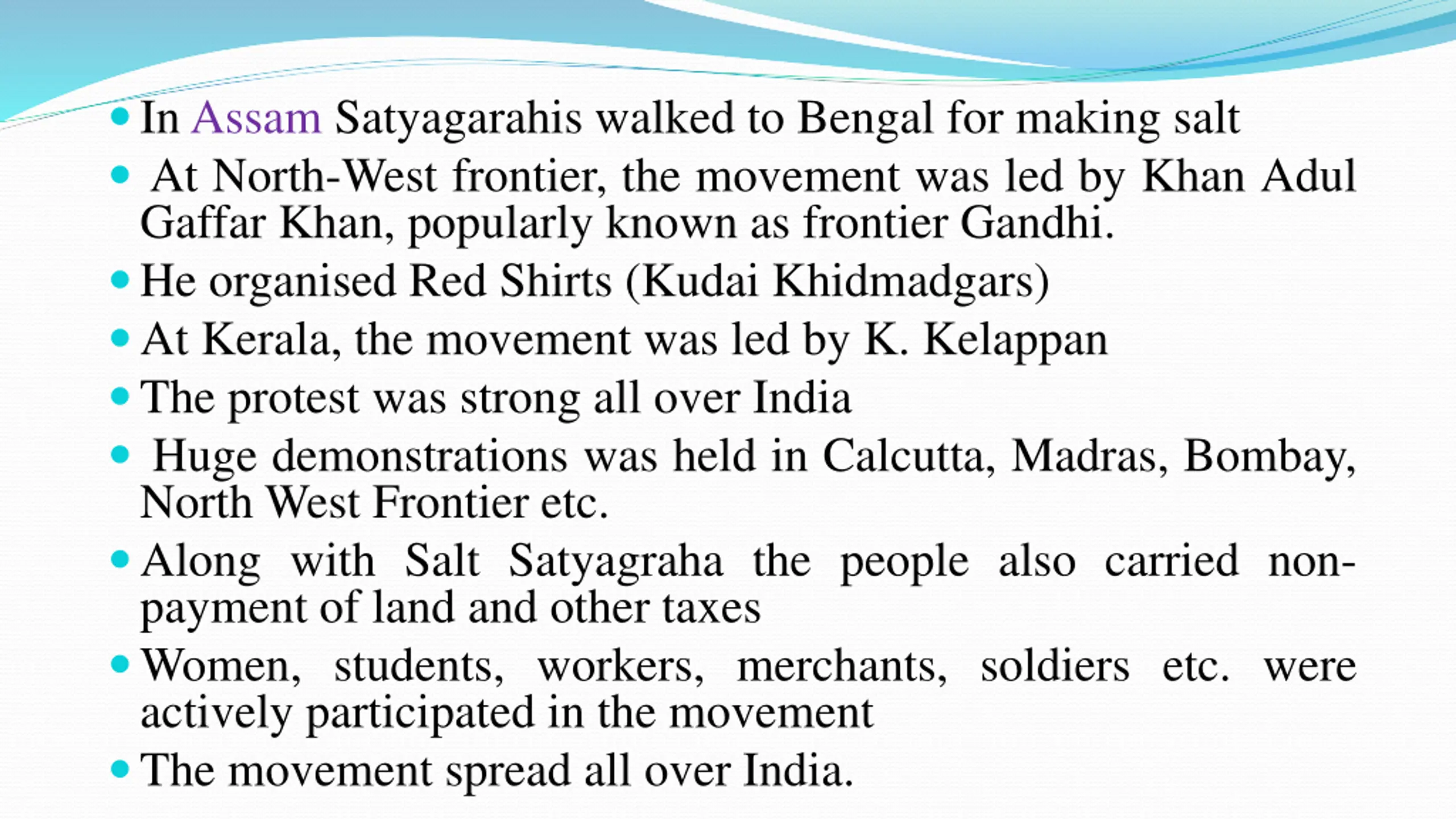 InAssam Satyagarahis walked to Bengal for making salt At North-West frontier, the movement was led by Khan Adul Gaffar Khan, popularly known as frontier Gandhi. He organised Red Shirts (Kudai Khidmadgars) At Kerala, the movement was led by K. Kelappan The protest was strong all over India Huge demonstrations was held in Calcutta, Madras, Bombay, North West Frontier etc. Along with Salt Satyagraha the people also carried non- payment of land and other taxes Women, students, workers, merchants, soldiers etc. were actively participated in the movement The movement spread all over India.