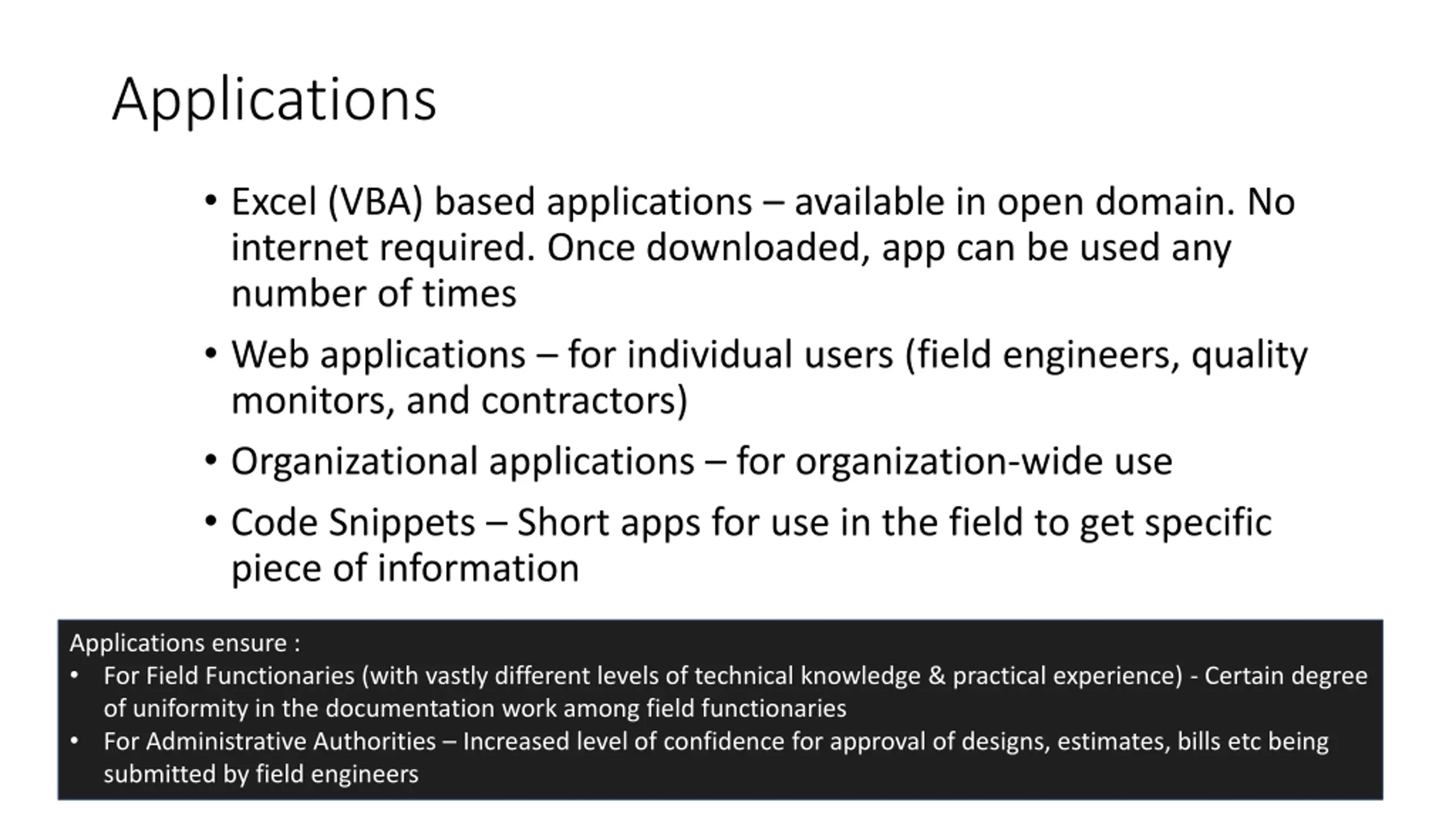 Applications Excel (VBA) based applications available in open domain. No internet required. Once downloaded, app can be used any number of times Web applications for individual users (field engineers, quality monitors, and contractors) Organizational applications for organization-wide use Code Snippets Short apps for use in the field to get specific piece of information Applications ensure : For Field Functionaries (with vastly different levels of technical knowledge & practical experience) - Certain degree of uniformity in the documentation work among field functionaries For Administrative Authorities Increased level of confidence for approval of designs, estimates, bills etc being submitted by field engineers