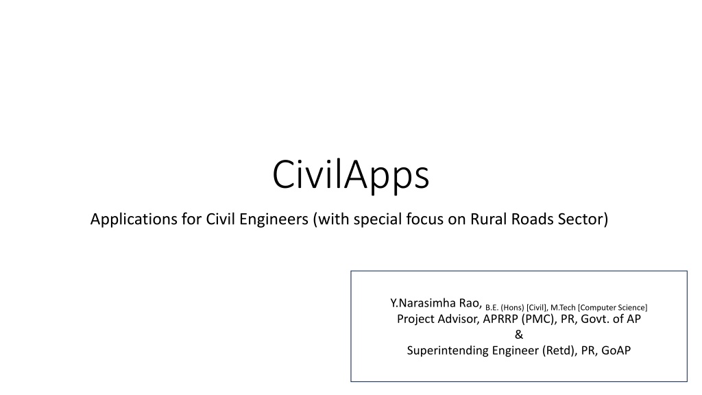 CivilApps Applications for Civil Engineers (with special focus on Rural Roads Sector) Y.Narasimha Rao, B.E. (Hons) [Civil], M.Tech [Computer Science] Project Advisor, APRRP (PMC), PR, Govt. of AP & Superintending Engineer (Retd), PR, GoAP
