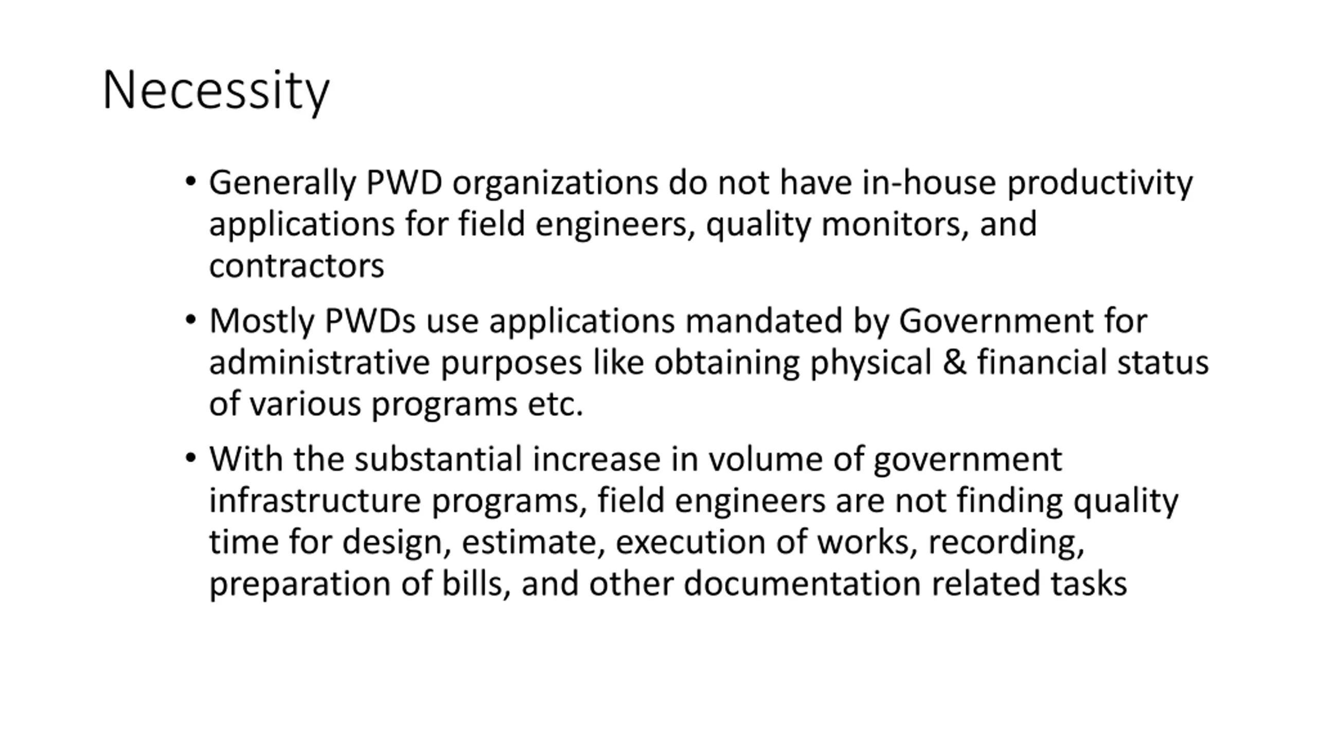 Necessity Generally PWD organizations do not have in-house productivity applications for field engineers, quality monitors, and contractors Mostly PWDs use applications mandated by Government for administrative purposes like obtaining physical & financial status of various programs etc. With the substantial increase in volume of government infrastructure programs, field engineers are not finding quality time for design, estimate, execution of works, recording, preparation of bills, and other documentation related tasks