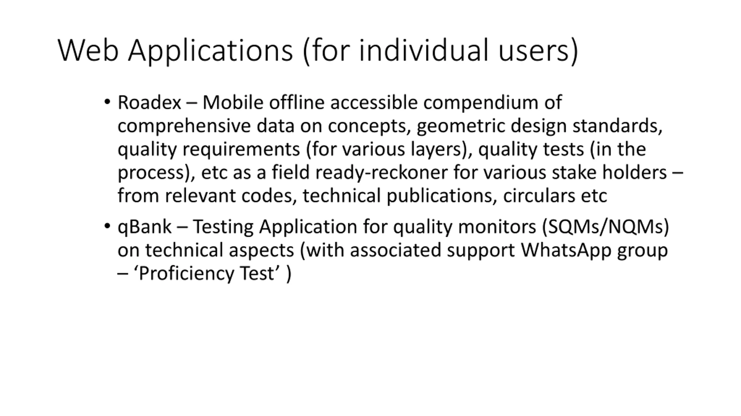 Web Applications (for individual users) Roadex Mobile offline accessible compendium of comprehensive data on concepts, geometric design standards, quality requirements (for various layers), quality tests (in the process), etc as a field ready-reckoner for various stake holders from relevant codes, technical publications, circulars etc qBank Testing Application for quality monitors (SQMs/NQMs) on technical aspects (with associated support WhatsApp group Proficiency Test )