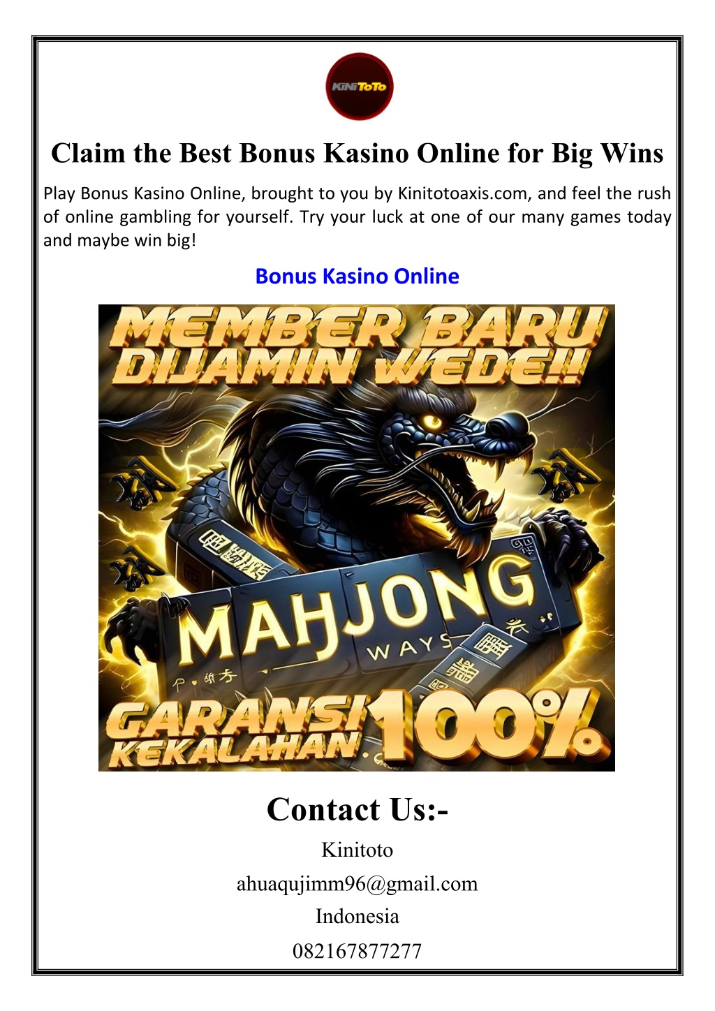 Claim the Best Bonus Kasino Online for Big Wins Play Bonus Kasino Online, brought to you by Kinitotoaxis.com, and feel the rush of online gambling for yourself. Try your luck at one of our many games today and maybe win big! Bonus Kasino Online Contact Us:- Kinitoto ahuaqujimm96@gmail.com Indonesia 082167877277
