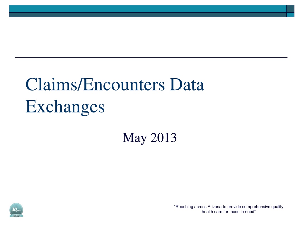Claims/Encounters Data Exchanges May 2013 Reaching across Arizona to provide comprehensive quality health care for those in need