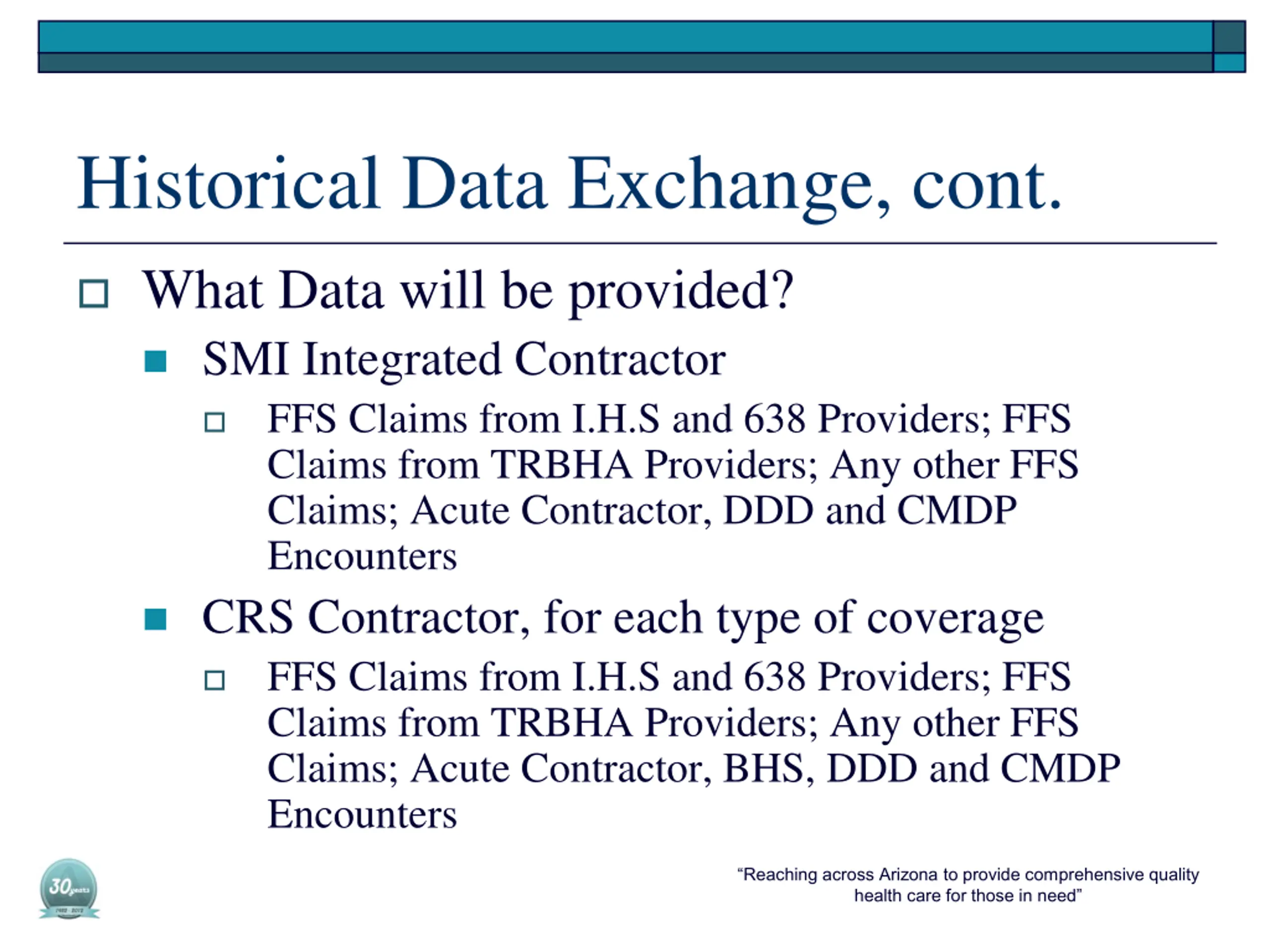 Historical Data Exchange, cont. What Data will be provided? SMI Integrated Contractor FFS Claims from I.H.S and 638 Providers; FFS Claims from TRBHA Providers; Any other FFS Claims; Acute Contractor, DDD and CMDP Encounters CRS Contractor, for each type of coverage FFS Claims from I.H.S and 638 Providers; FFS Claims from TRBHA Providers; Any other FFS Claims; Acute Contractor, BHS, DDD and CMDP Encounters Reaching across Arizona to provide comprehensive quality health care for those in need