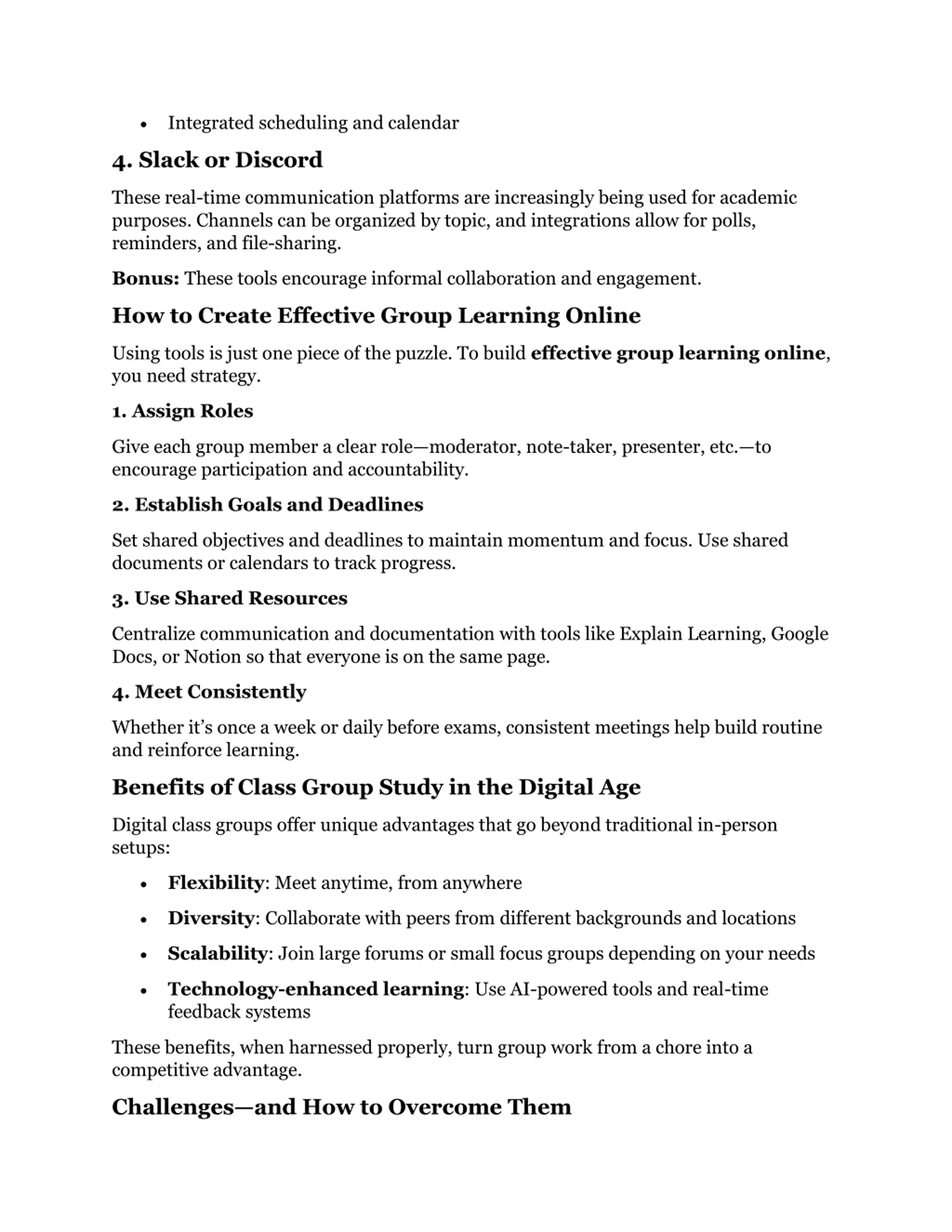Integrated scheduling and calendar 4. Slack or Discord These real-time communication platforms are increasingly being used for academic purposes. Channels can be organized by topic, and integrations allow for polls, reminders, and file-sharing. Bonus: These tools encourage informal collaboration and engagement. How to Create Effective Group Learning Online Using tools is just one piece of the puzzle. To build effective group learning online, you need strategy. 1. Assign Roles Give each group member a clear role moderator, note-taker, presenter, etc. to encourage participation and accountability. 2. Establish Goals and Deadlines Set shared objectives and deadlines to maintain momentum and focus. Use shared documents or calendars to track progress. 3. Use Shared Resources Centralize communication and documentation with tools like Explain Learning, Google Docs, or Notion so that everyone is on the same page. 4. Meet Consistently Whether it s once a week or daily before exams, consistent meetings help build routine and reinforce learning. Benefits of Class Group Study in the Digital Age Digital class groups offer unique advantages that go beyond traditional in-person setups: Flexibility: Meet anytime, from anywhere Diversity: Collaborate with peers from different backgrounds and locations Scalability: Join large forums or small focus groups depending on your needs Technology-enhanced learning: Use AI-powered tools and real-time feedback systems These benefits, when harnessed properly, turn group work from a chore into a competitive advantage. Challenges and How to Overcome Them