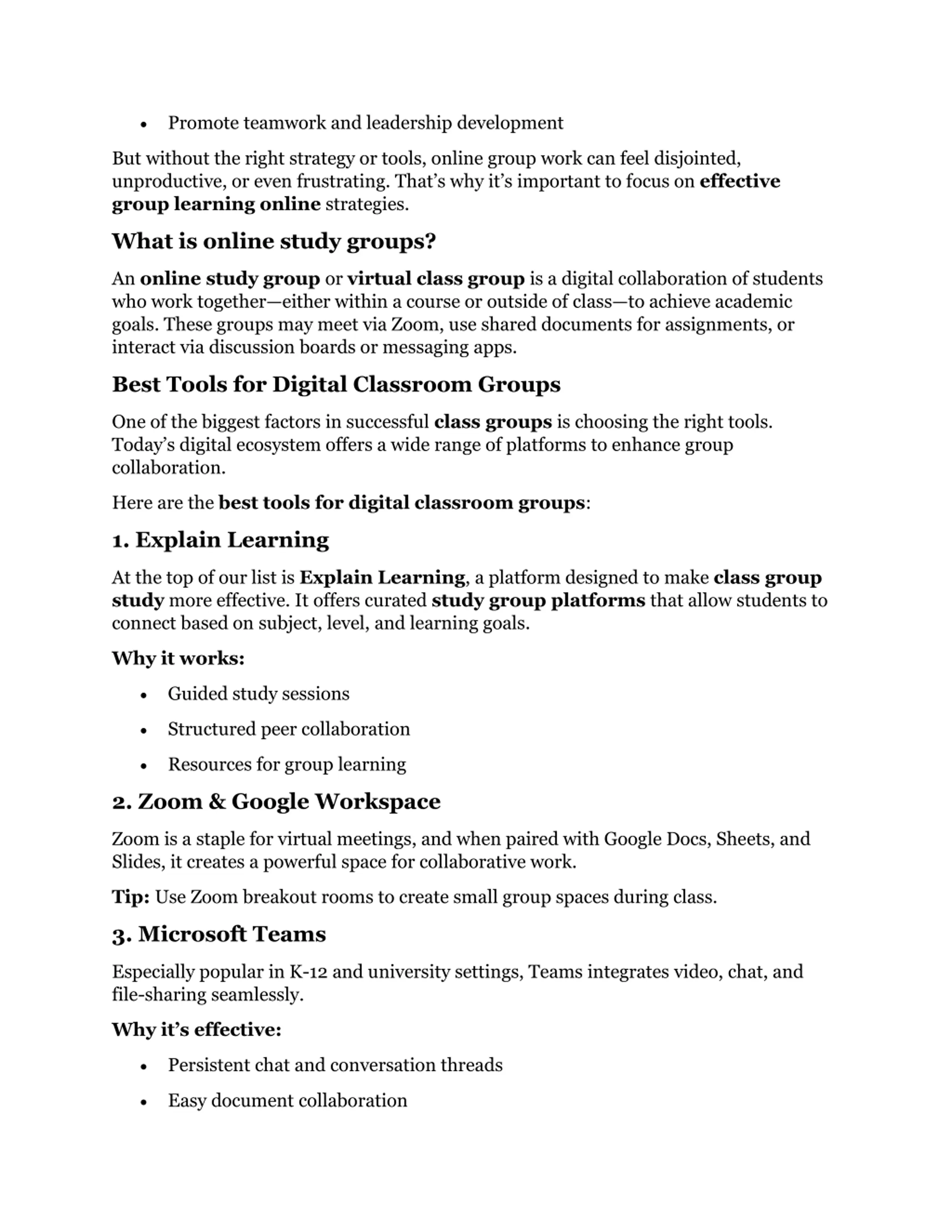 Promote teamwork and leadership development But without the right strategy or tools, online group work can feel disjointed, unproductive, or even frustrating. That s why it s important to focus on effective group learning online strategies. What is online study groups? An online study group or virtual class group is a digital collaboration of students who work together either within a course or outside of class to achieve academic goals. These groups may meet via Zoom, use shared documents for assignments, or interact via discussion boards or messaging apps. Best Tools for Digital Classroom Groups One of the biggest factors in successful class groups is choosing the right tools. Today s digital ecosystem offers a wide range of platforms to enhance group collaboration. Here are the best tools for digital classroom groups: 1. Explain Learning At the top of our list is Explain Learning, a platform designed to make class group study more effective. It offers curated study group platforms that allow students to connect based on subject, level, and learning goals. Why it works: Guided study sessions Structured peer collaboration Resources for group learning 2. Zoom & Google Workspace Zoom is a staple for virtual meetings, and when paired with Google Docs, Sheets, and Slides, it creates a powerful space for collaborative work. Tip: Use Zoom breakout rooms to create small group spaces during class. 3. Microsoft Teams Especially popular in K-12 and university settings, Teams integrates video, chat, and file-sharing seamlessly. Why it s effective: Persistent chat and conversation threads Easy document collaboration