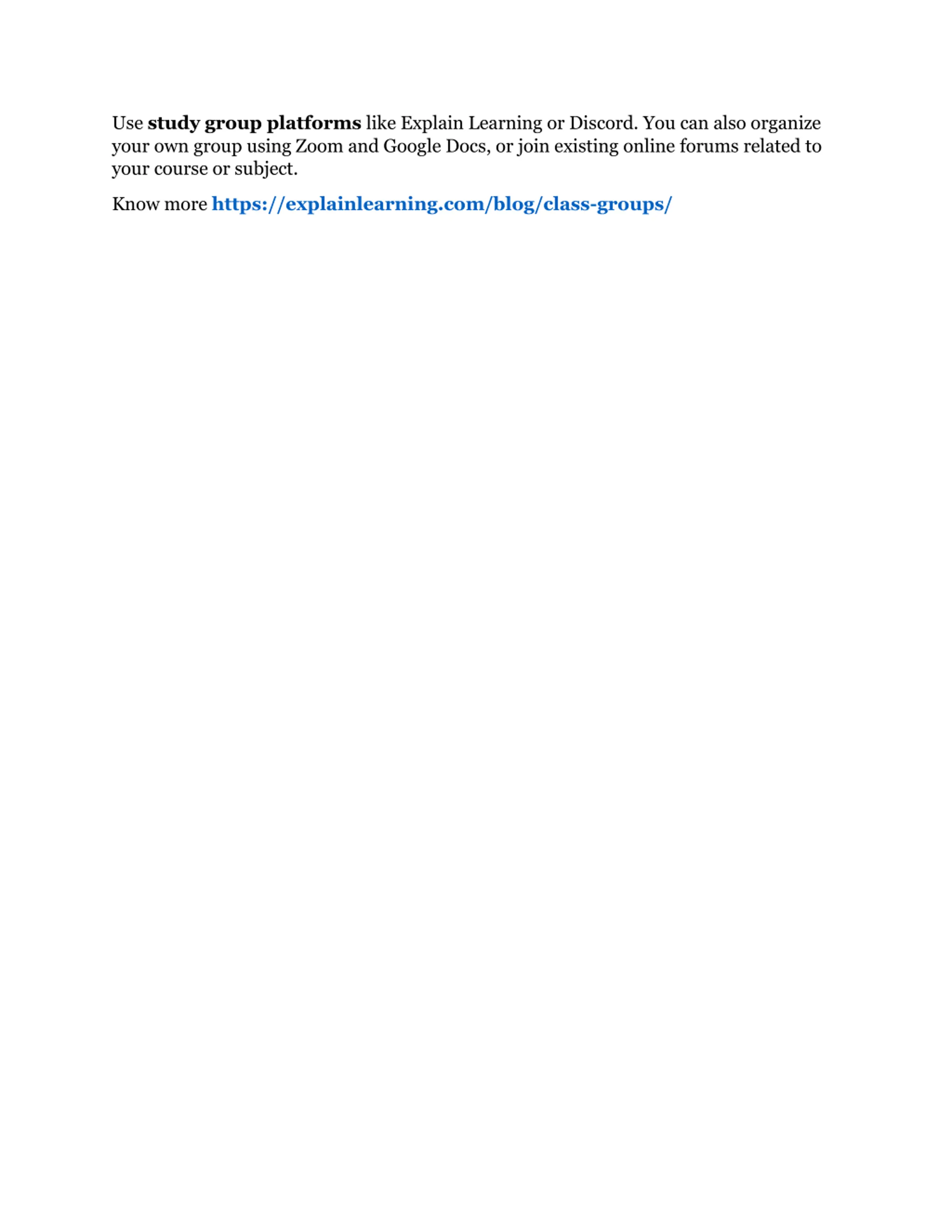 Use study group platforms like Explain Learning or Discord. You can also organize your own group using Zoom and Google Docs, or join existing online forums related to your course or subject. Know more https://explainlearning.com/blog/class-groups/