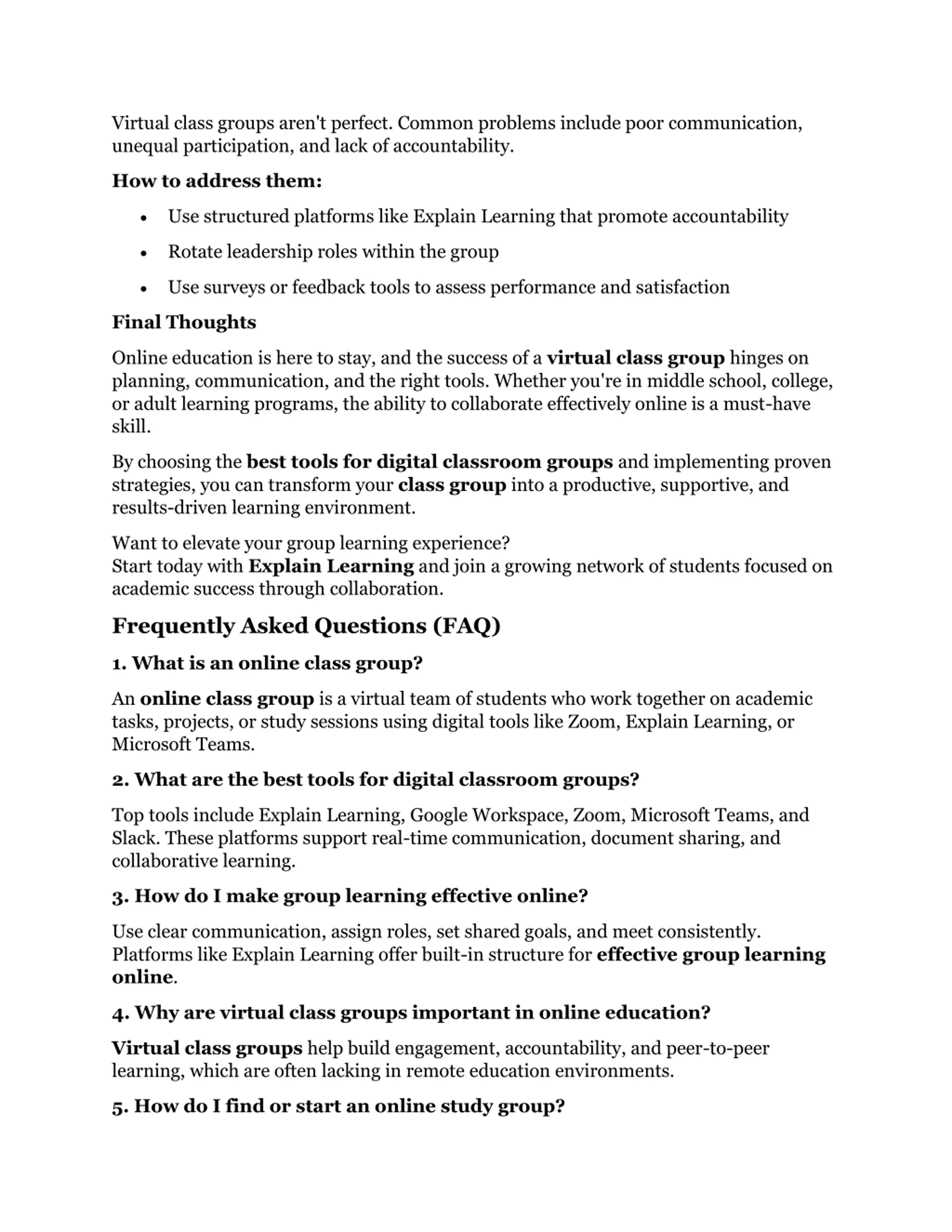 Virtual class groups aren't perfect. Common problems include poor communication, unequal participation, and lack of accountability. How to address them: Use structured platforms like Explain Learning that promote accountability Rotate leadership roles within the group Use surveys or feedback tools to assess performance and satisfaction Final Thoughts Online education is here to stay, and the success of a virtual class group hinges on planning, communication, and the right tools. Whether you're in middle school, college, or adult learning programs, the ability to collaborate effectively online is a must-have skill. By choosing the best tools for digital classroom groups and implementing proven strategies, you can transform your class group into a productive, supportive, and results-driven learning environment. Want to elevate your group learning experience? Start today with Explain Learning and join a growing network of students focused on academic success through collaboration. Frequently Asked Questions (FAQ) 1. What is an online class group? An online class group is a virtual team of students who work together on academic tasks, projects, or study sessions using digital tools like Zoom, Explain Learning, or Microsoft Teams. 2. What are the best tools for digital classroom groups? Top tools include Explain Learning, Google Workspace, Zoom, Microsoft Teams, and Slack. These platforms support real-time communication, document sharing, and collaborative learning. 3. How do I make group learning effective online? Use clear communication, assign roles, set shared goals, and meet consistently. Platforms like Explain Learning offer built-in structure for effective group learning online. 4. Why are virtual class groups important in online education? Virtual class groups help build engagement, accountability, and peer-to-peer learning, which are often lacking in remote education environments. 5. How do I find or start an online study group?