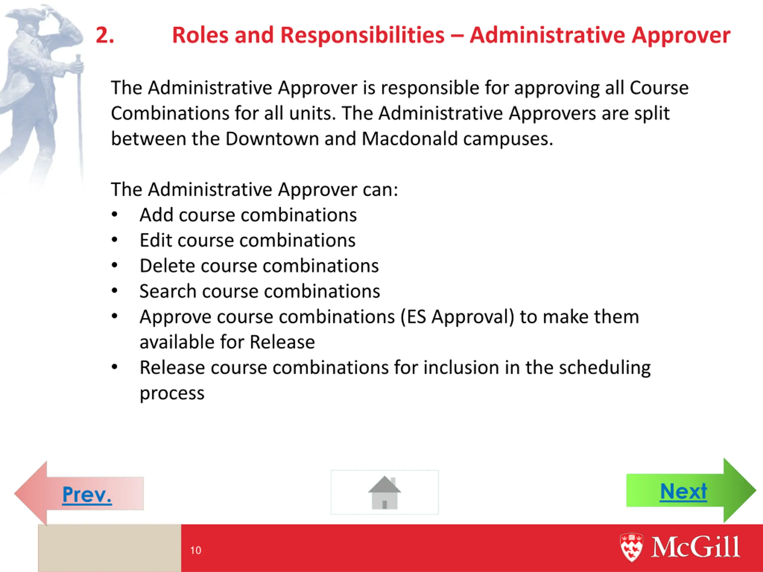 2. Roles and Responsibilities Administrative Approver The Administrative Approver is responsible for approving all Course Combinations for all units. The Administrative Approvers are split between the Downtown and Macdonald campuses. The Administrative Approver can: Add course combinations Edit course combinations Delete course combinations Search course combinations Approve course combinations (ES Approval) to make them available for Release Release course combinations for inclusion in the scheduling process Next Prev. 10